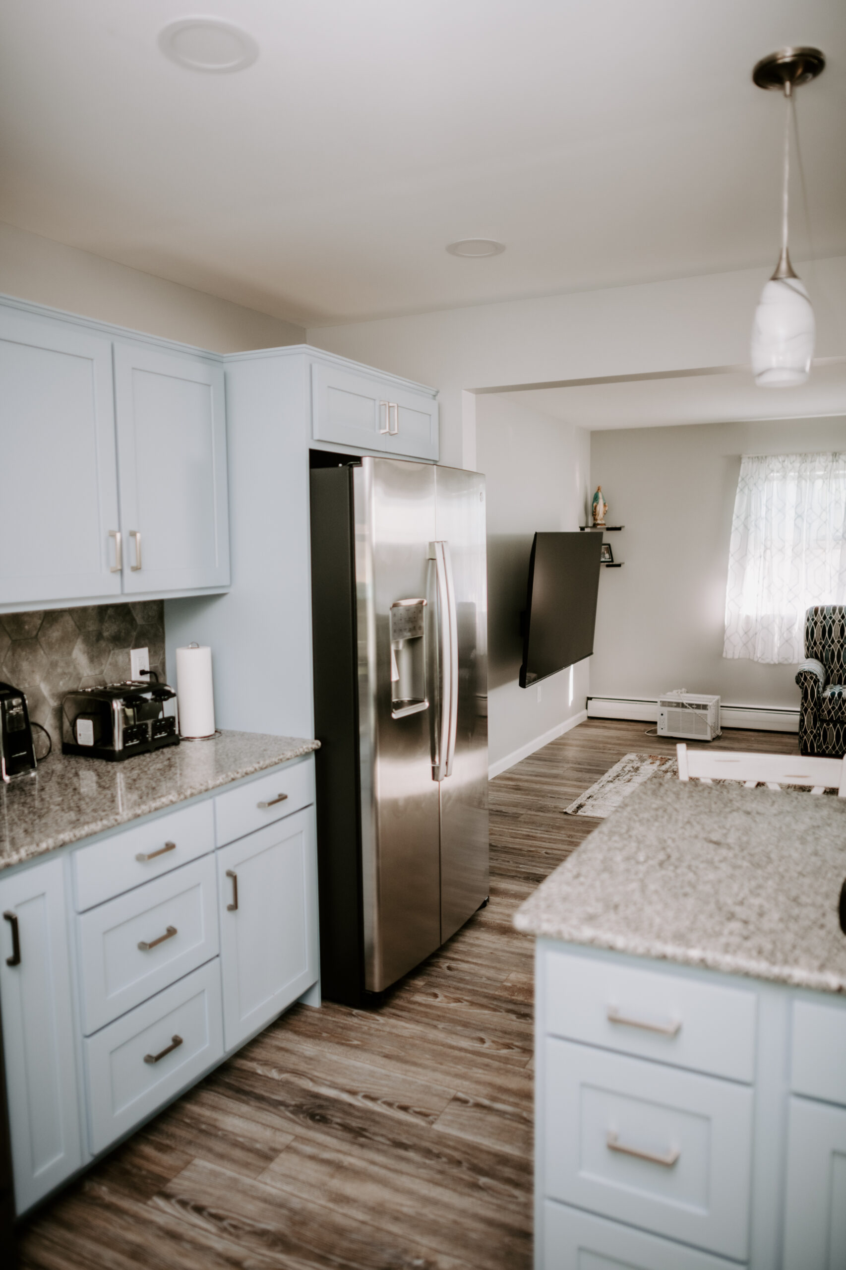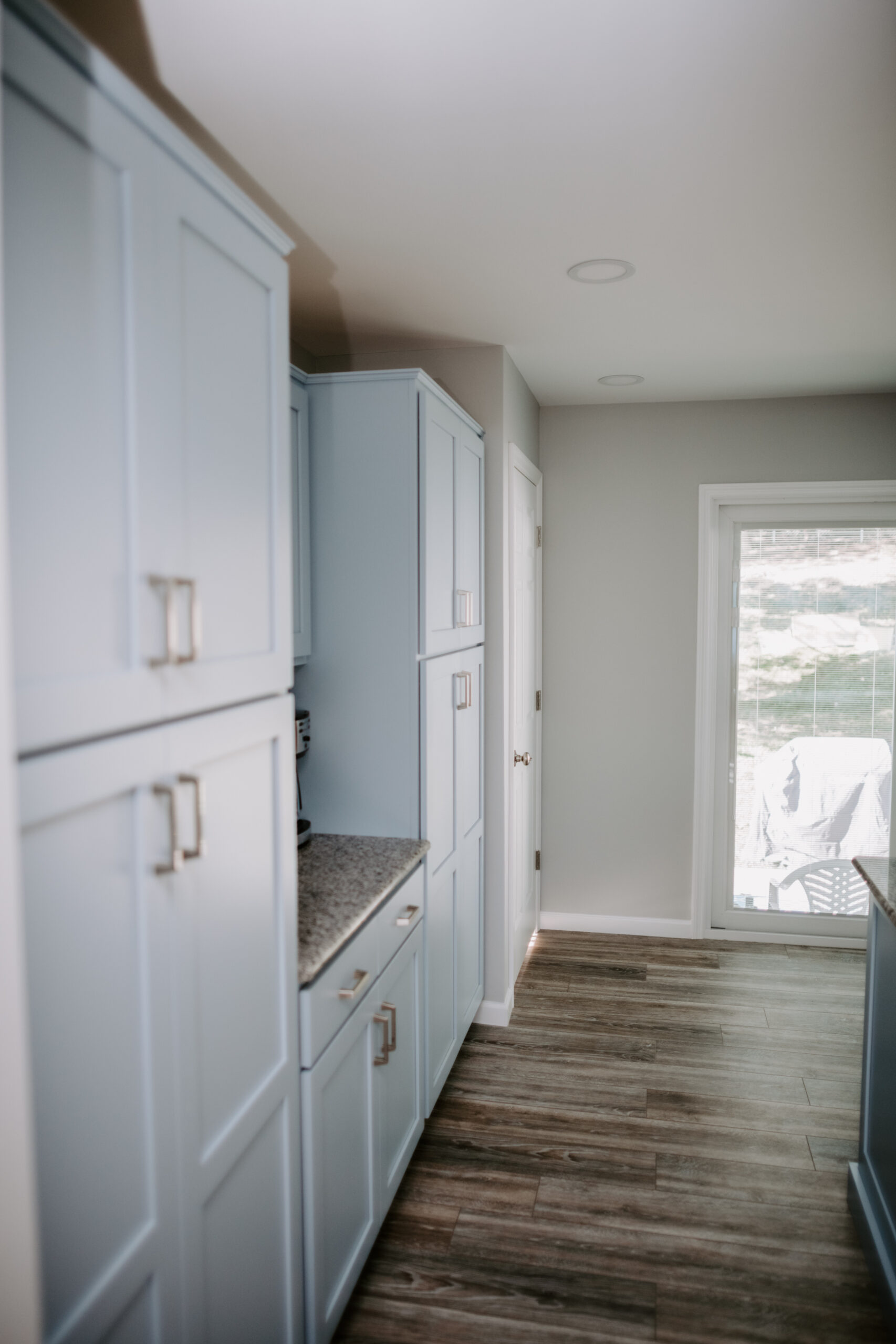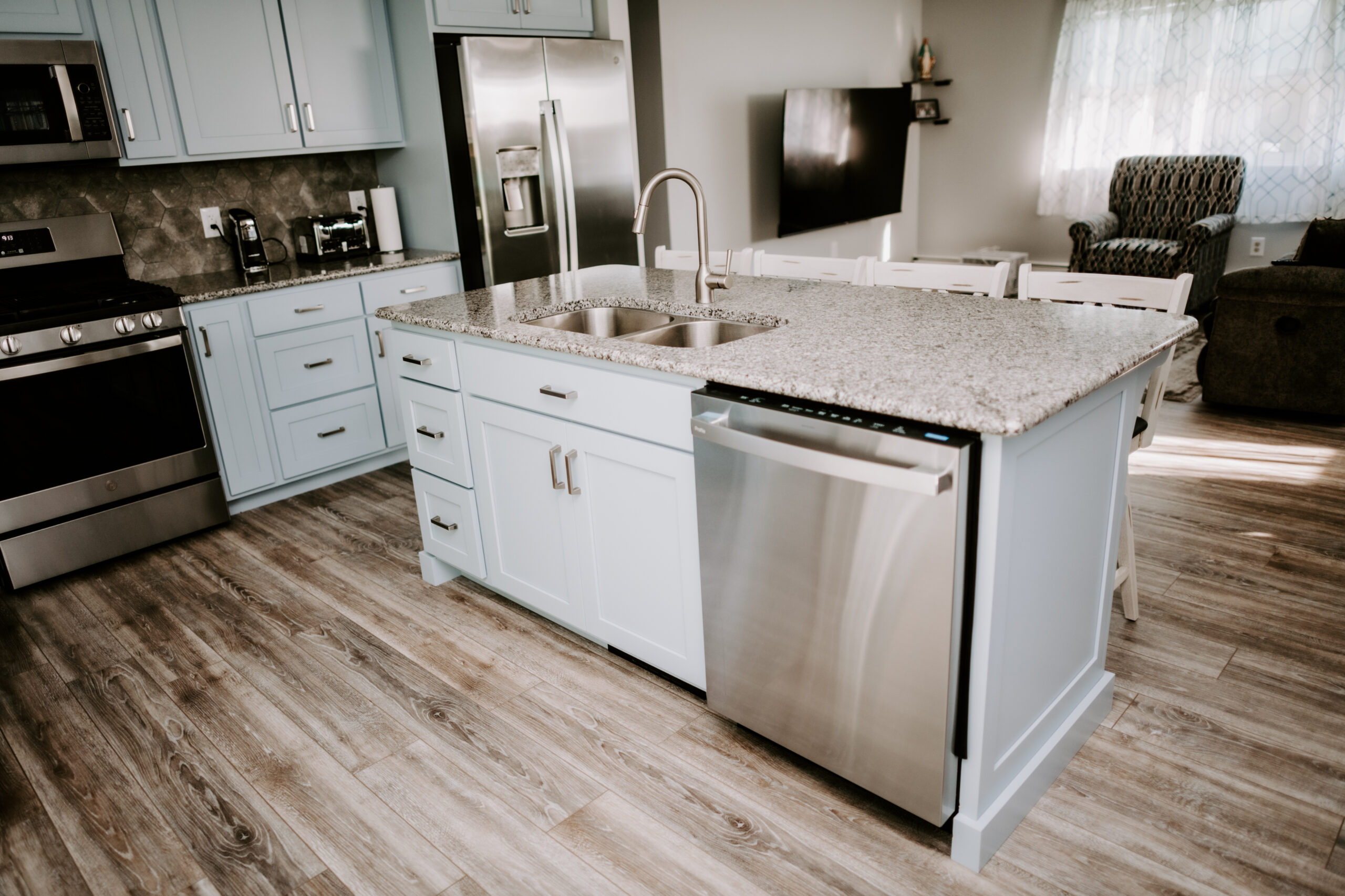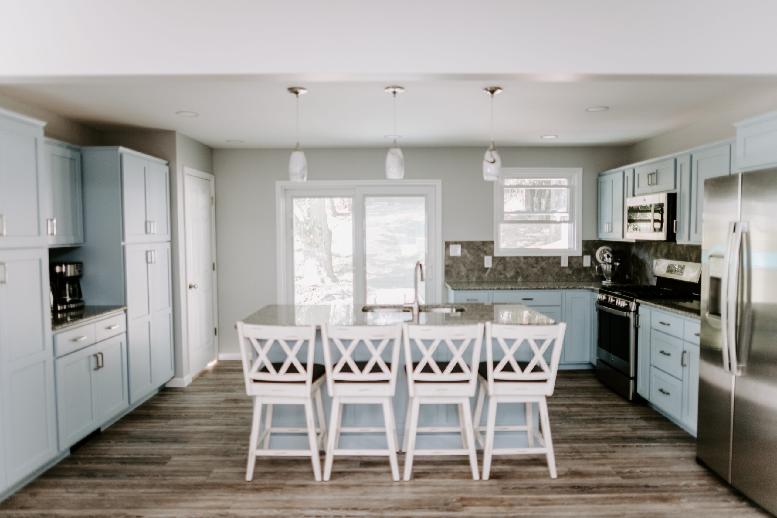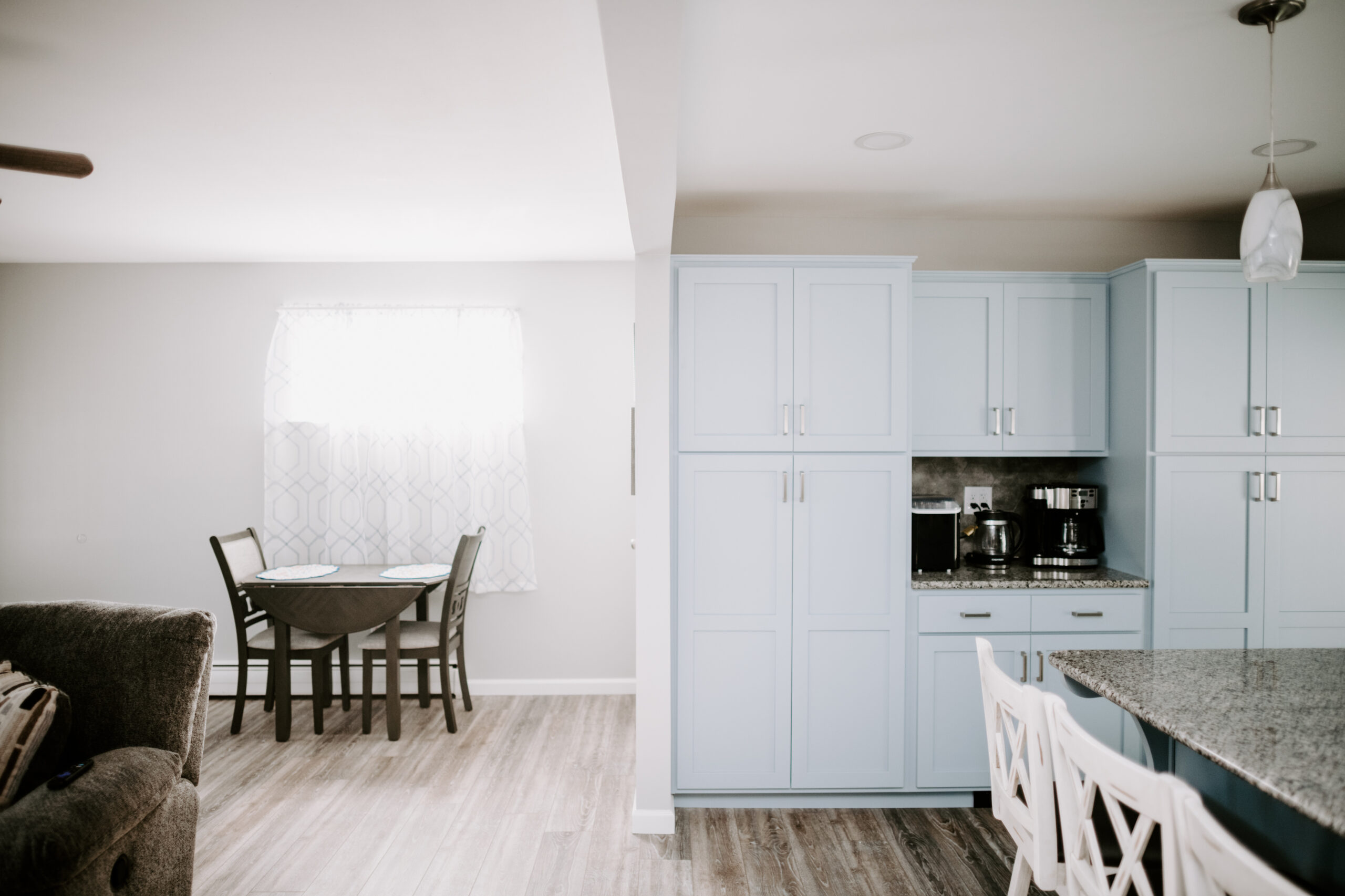 We created an open floor plan for this new kitchen, dining, and living room renovation. the country blue custom cabinets offer plenty of storage and set the stage for this new kitchen. The renovation also included a large kitchen island with a built-in sink and stainless steel appliances. Finally, LVP flooring was added throughout, along with gray accents on the countertop and tile backsplash.