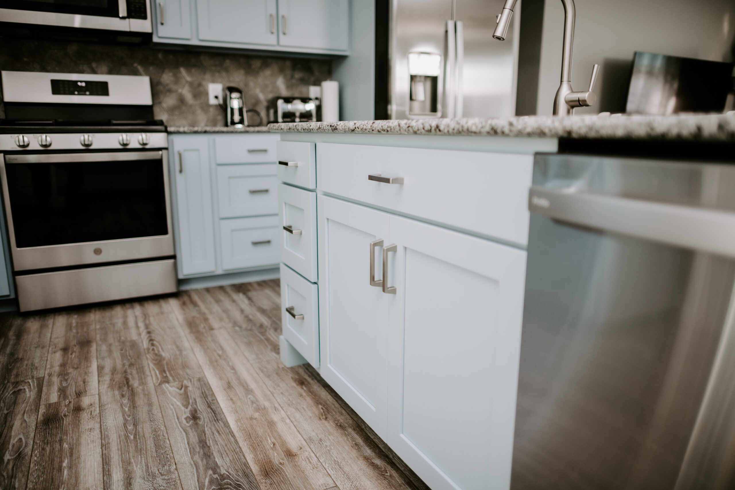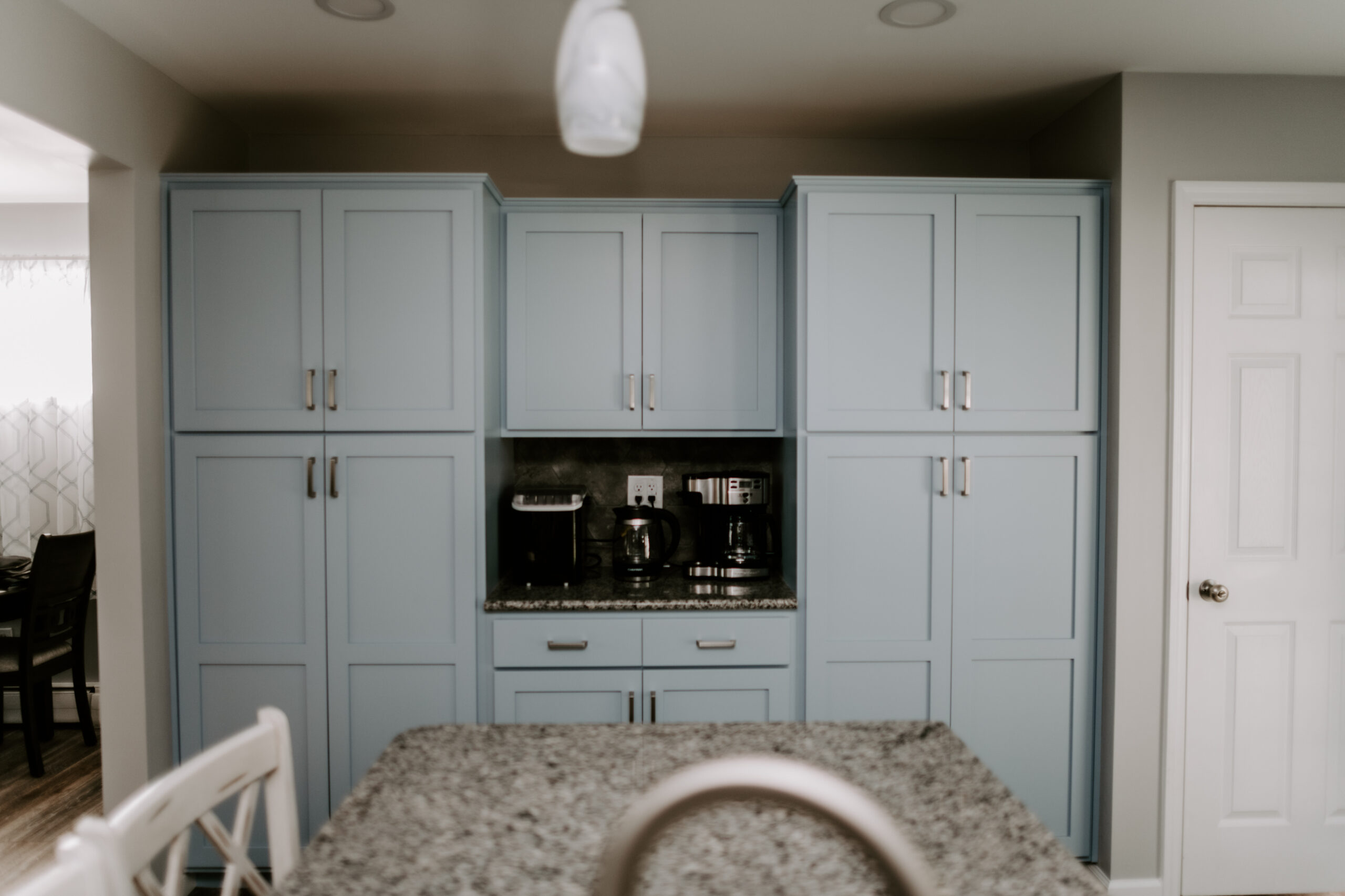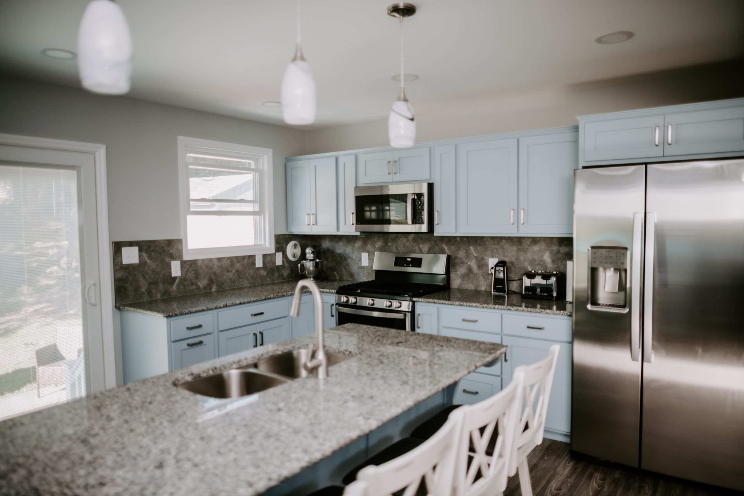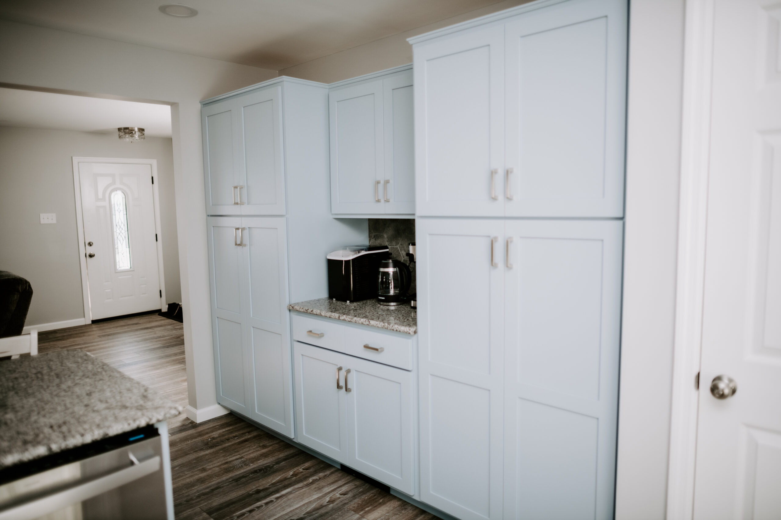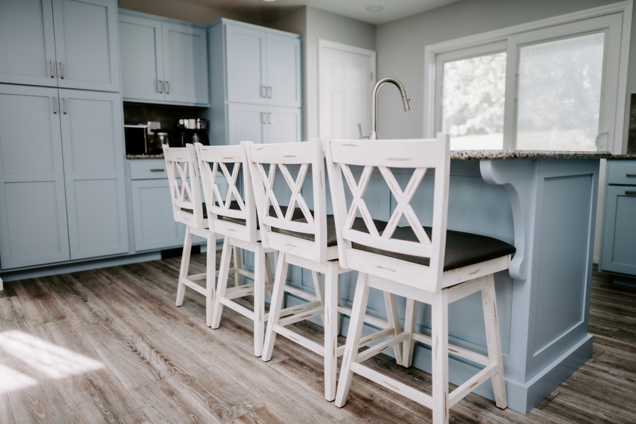 We created an open floor plan for this new kitchen, dining, and living room renovation. the country blue custom cabinets offer plenty of storage and set the stage for this new kitchen. The renovation also included a large kitchen island with a built-in sink and stainless steel appliances. Finally, LVP flooring was added throughout, along with gray accents on the countertop and tile backsplash.