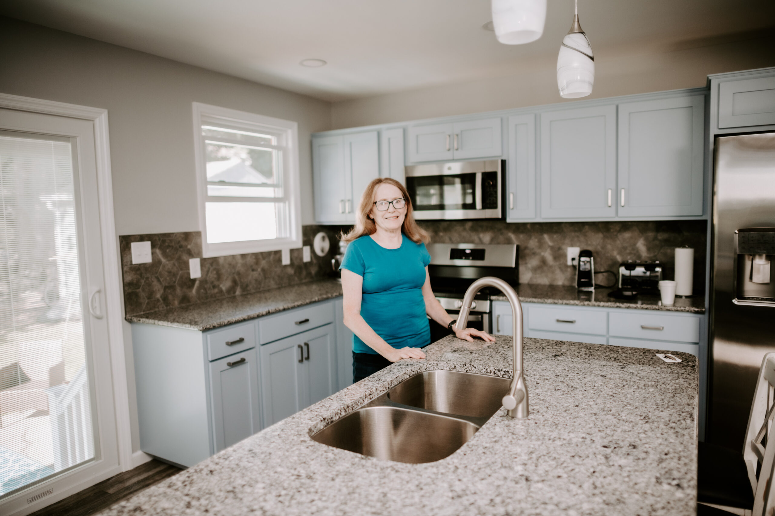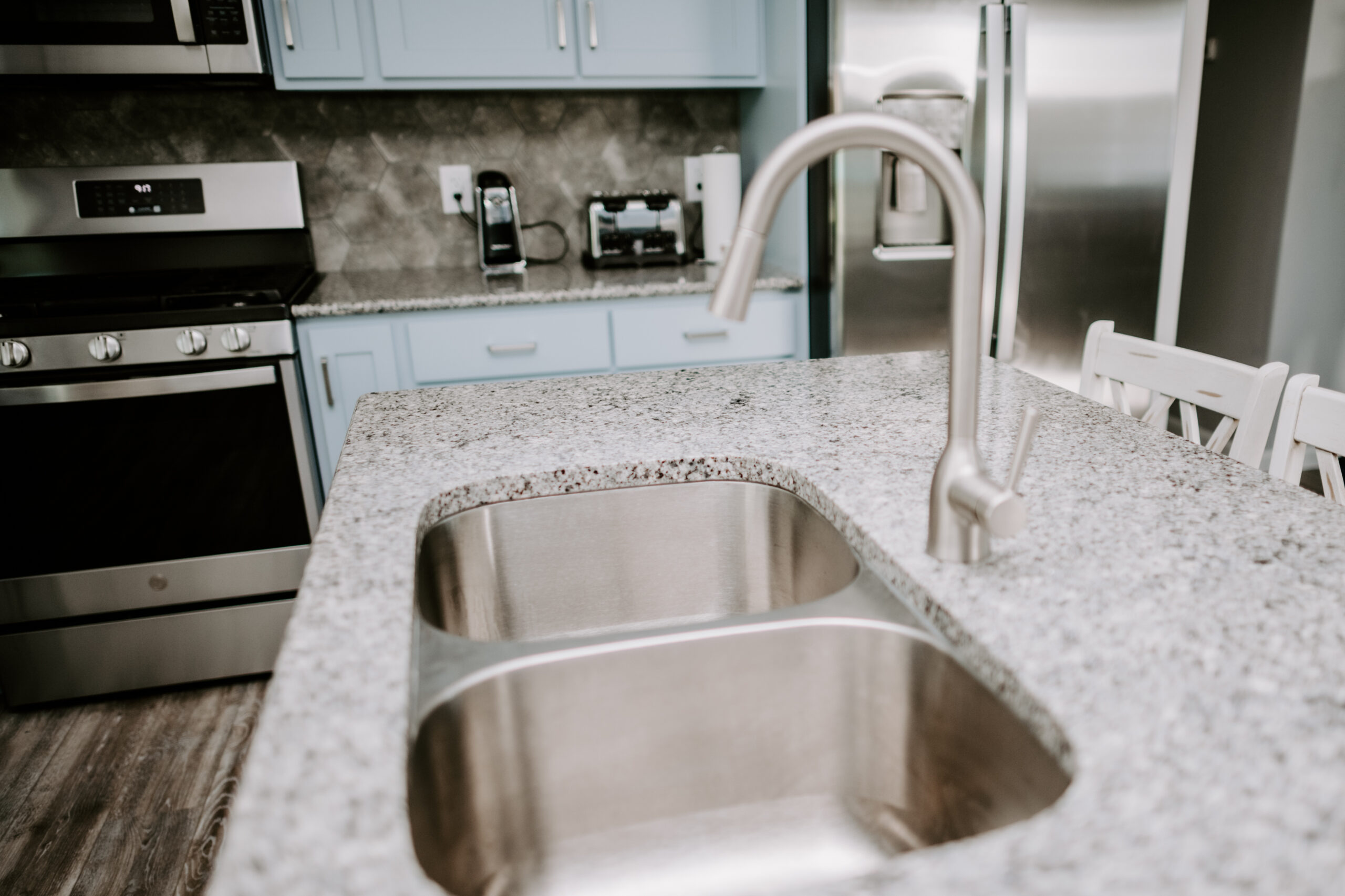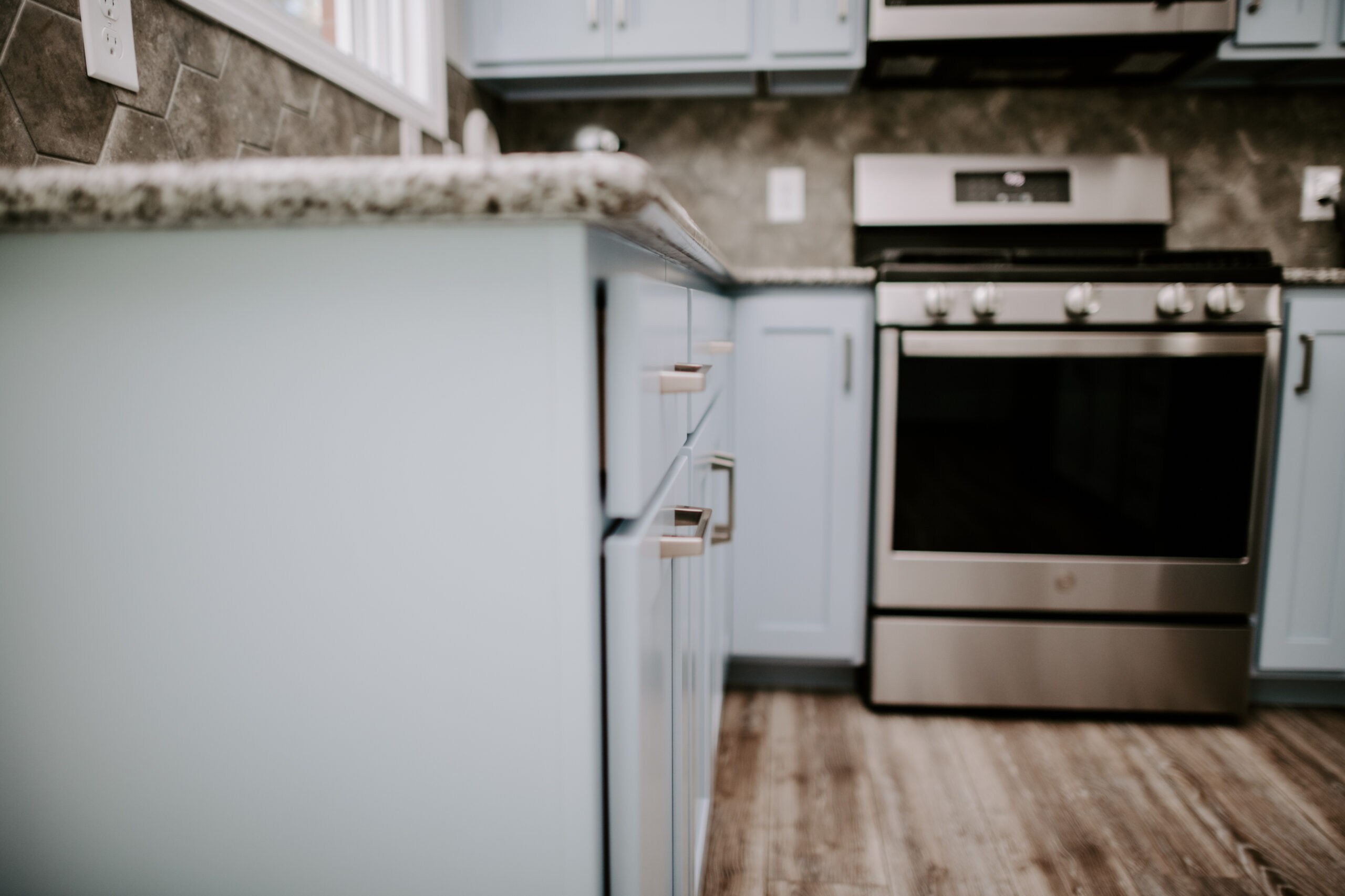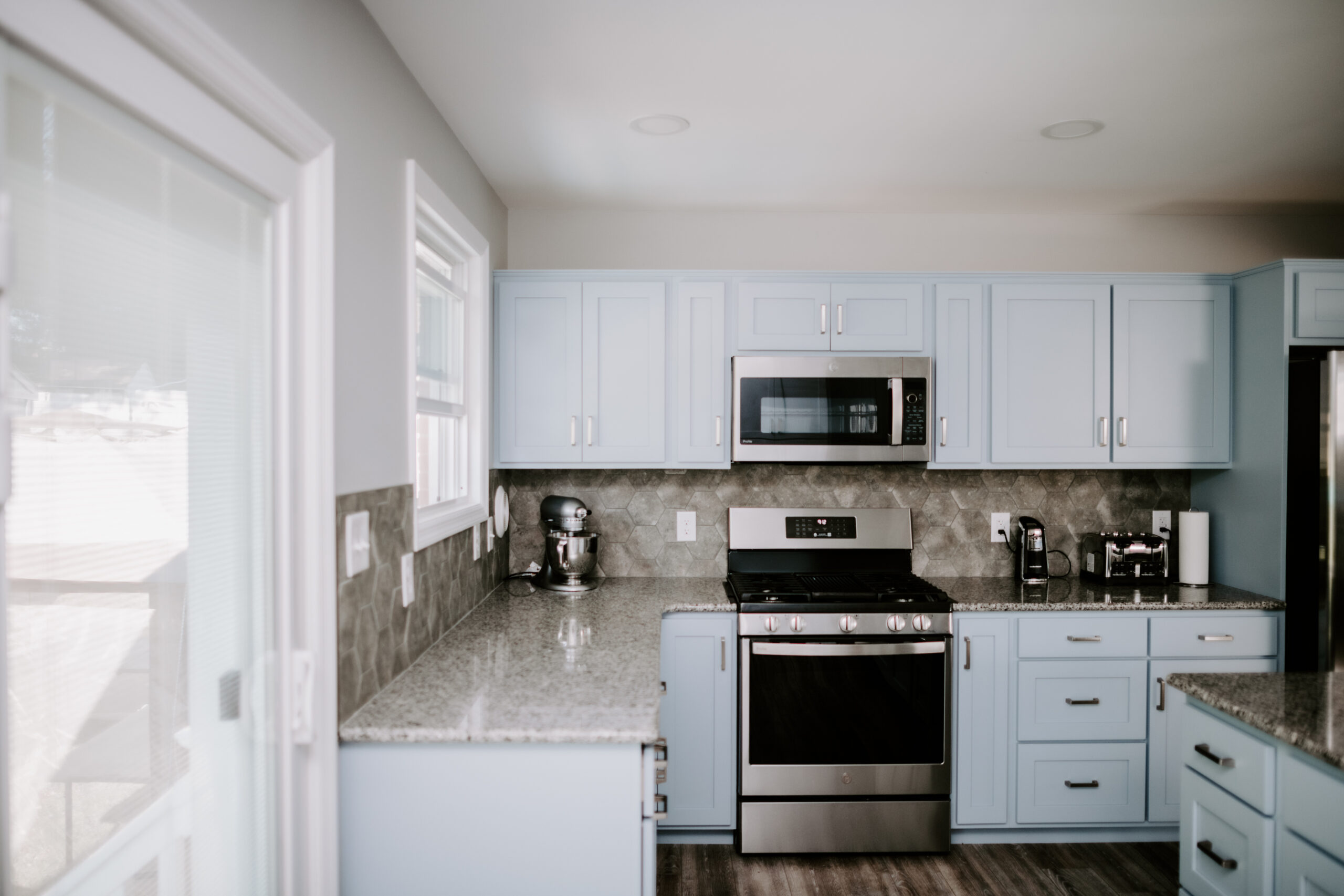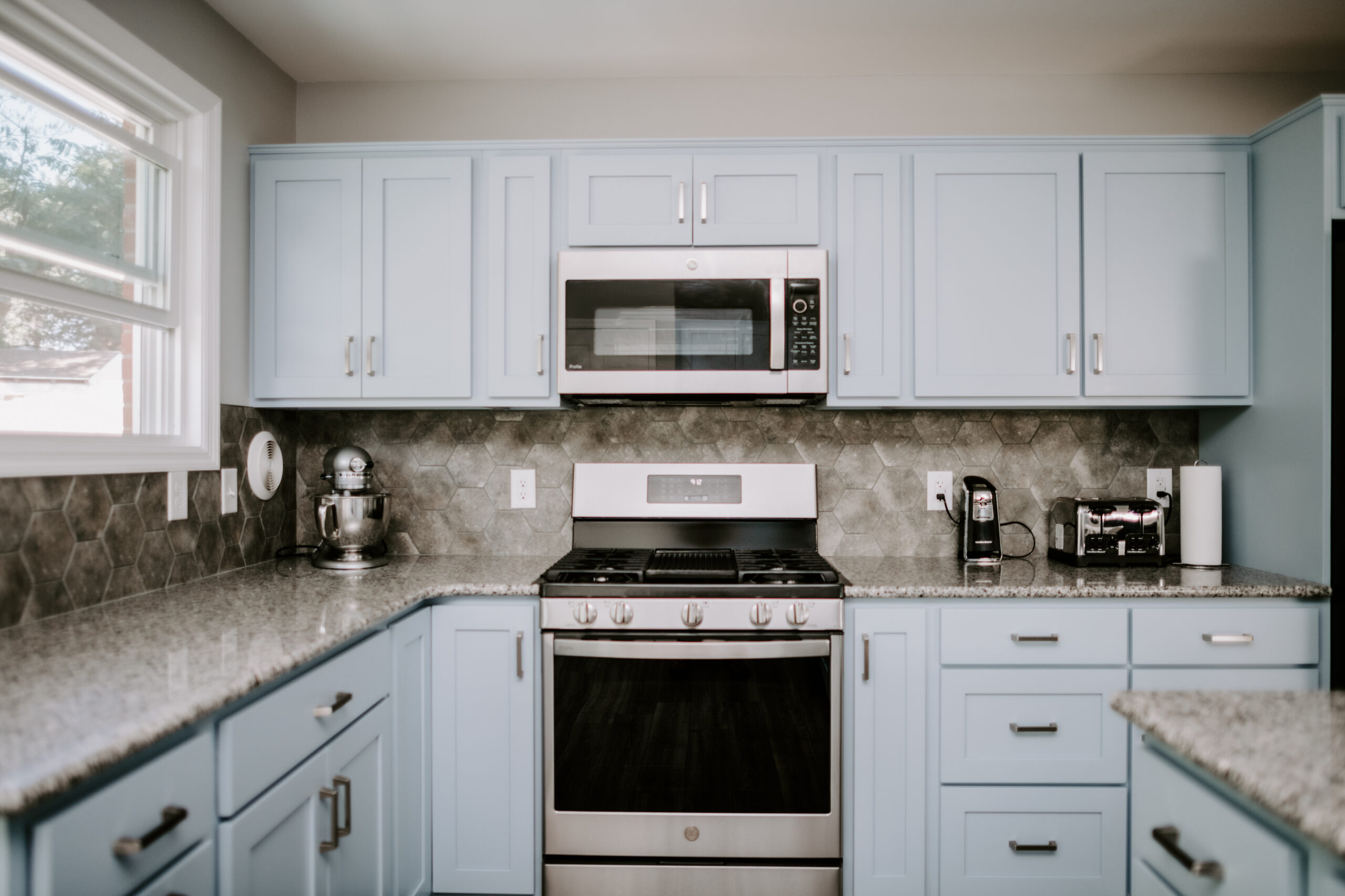 We created an open floor plan for this new kitchen, dining, and living room renovation. the country blue custom cabinets offer plenty of storage and set the stage for this new kitchen. The renovation also included a large kitchen island with a built-in sink and stainless steel appliances. Finally, LVP flooring was added throughout, along with gray accents on the countertop and tile backsplash.