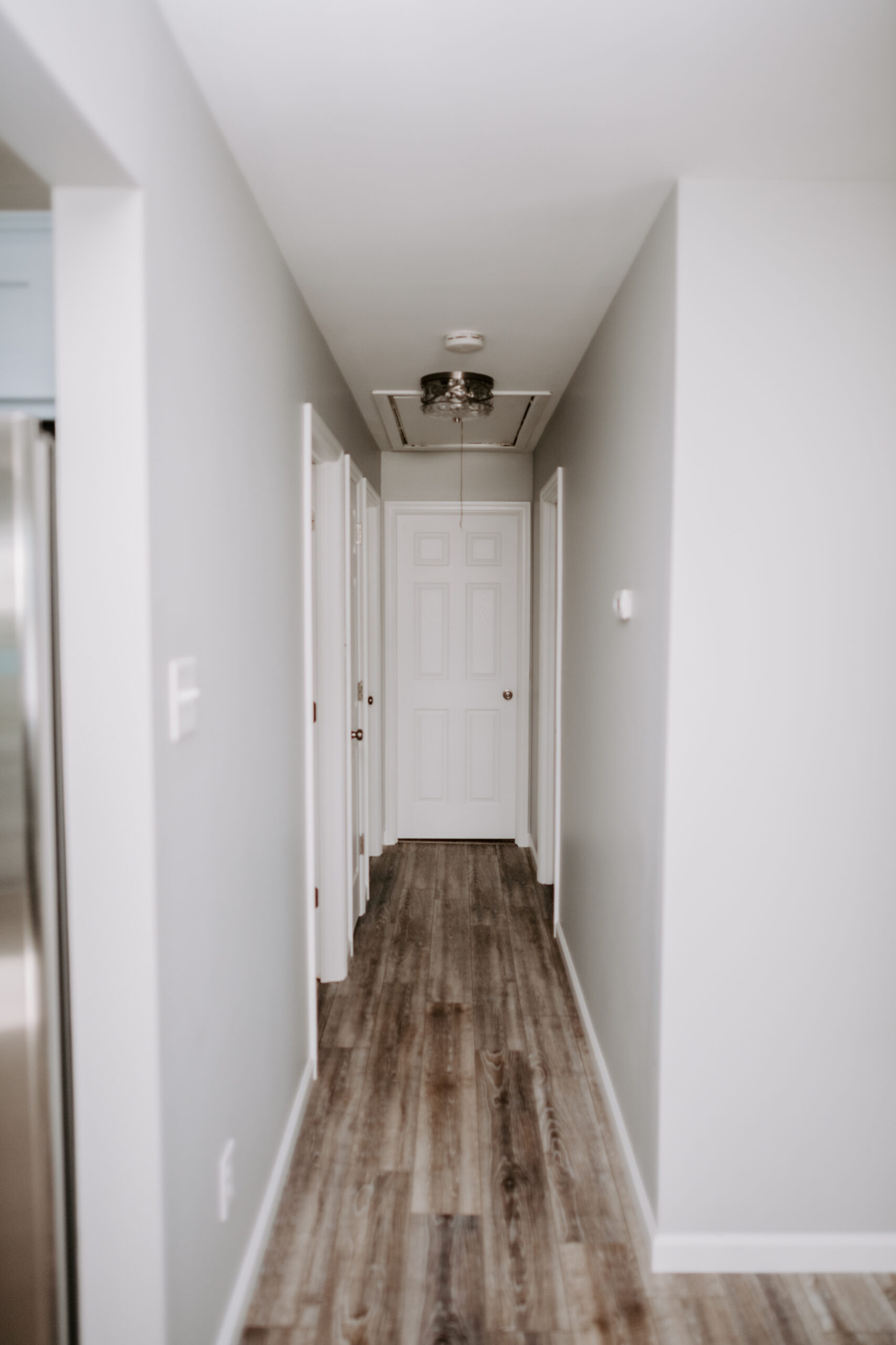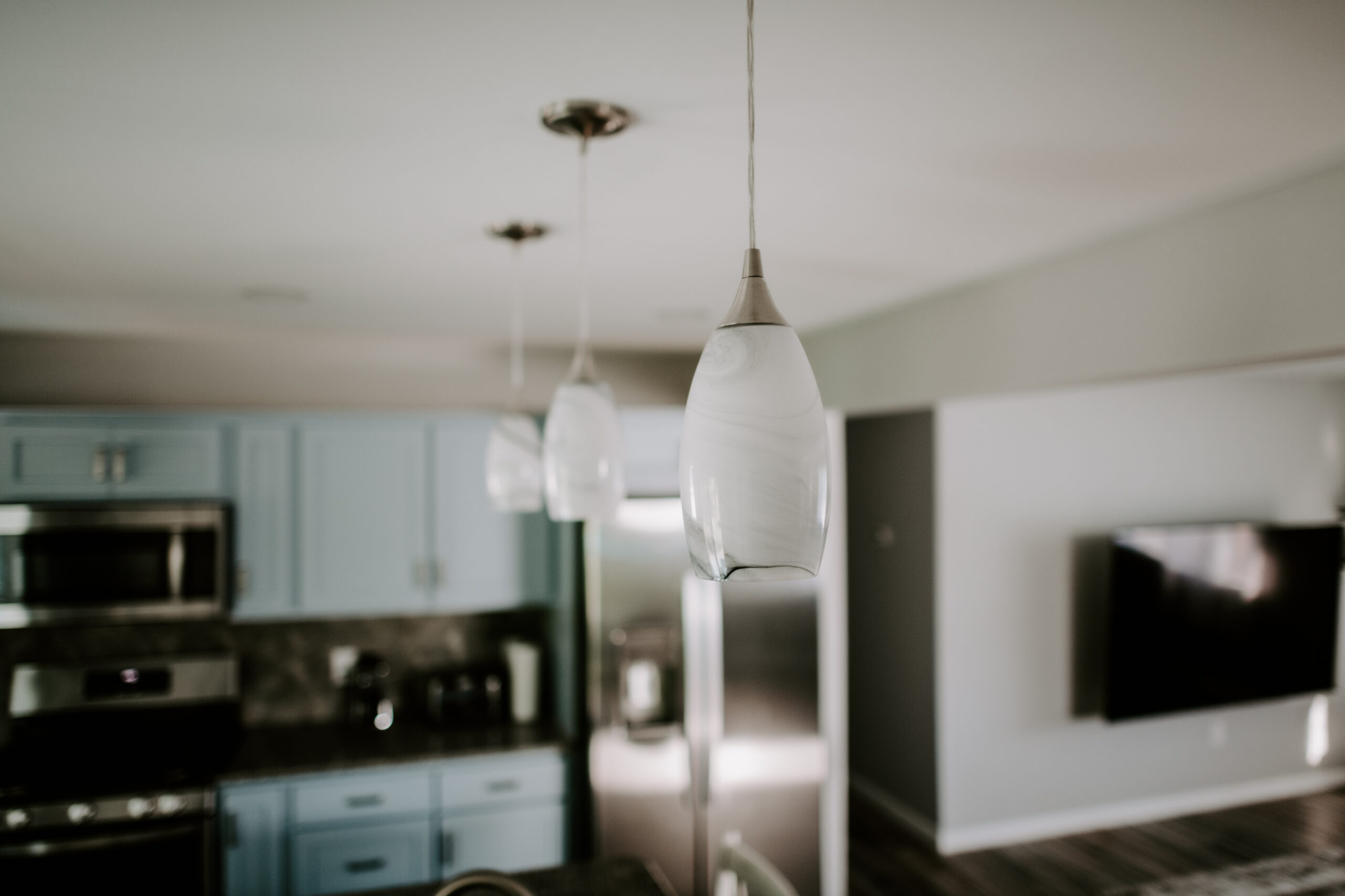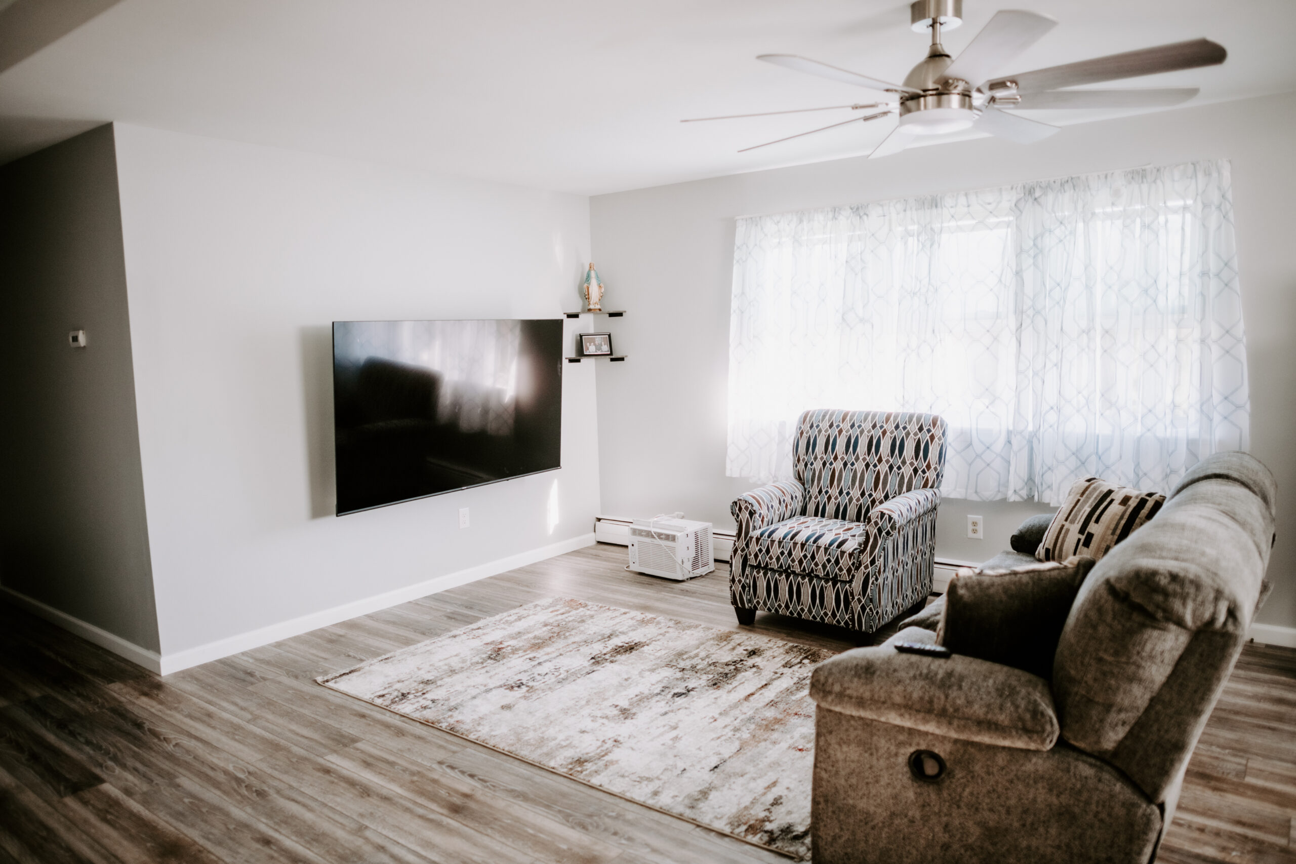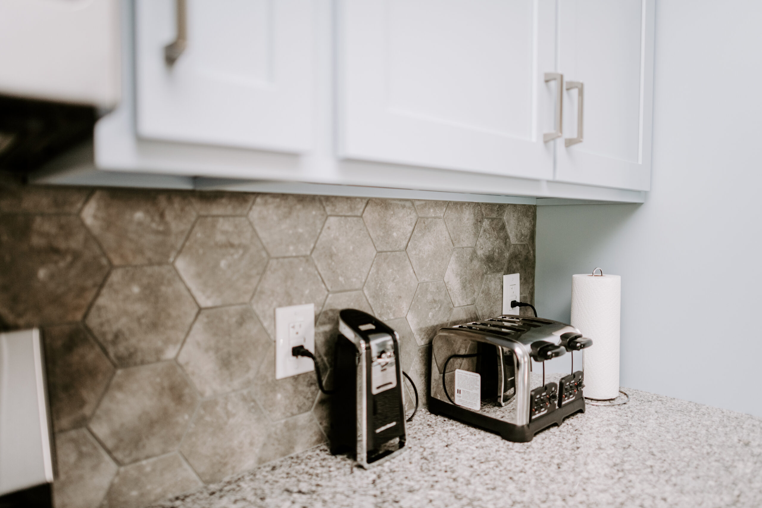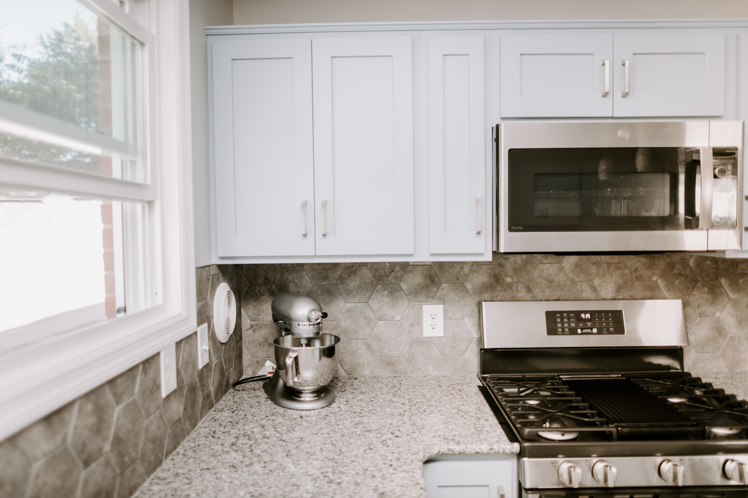 We created an open floor plan for this new kitchen, dining, and living room renovation. the country blue custom cabinets offer plenty of storage and set the stage for this new kitchen. The renovation also included a large kitchen island with a built-in sink and stainless steel appliances. Finally, LVP flooring was added throughout, along with gray accents on the countertop and tile backsplash.
