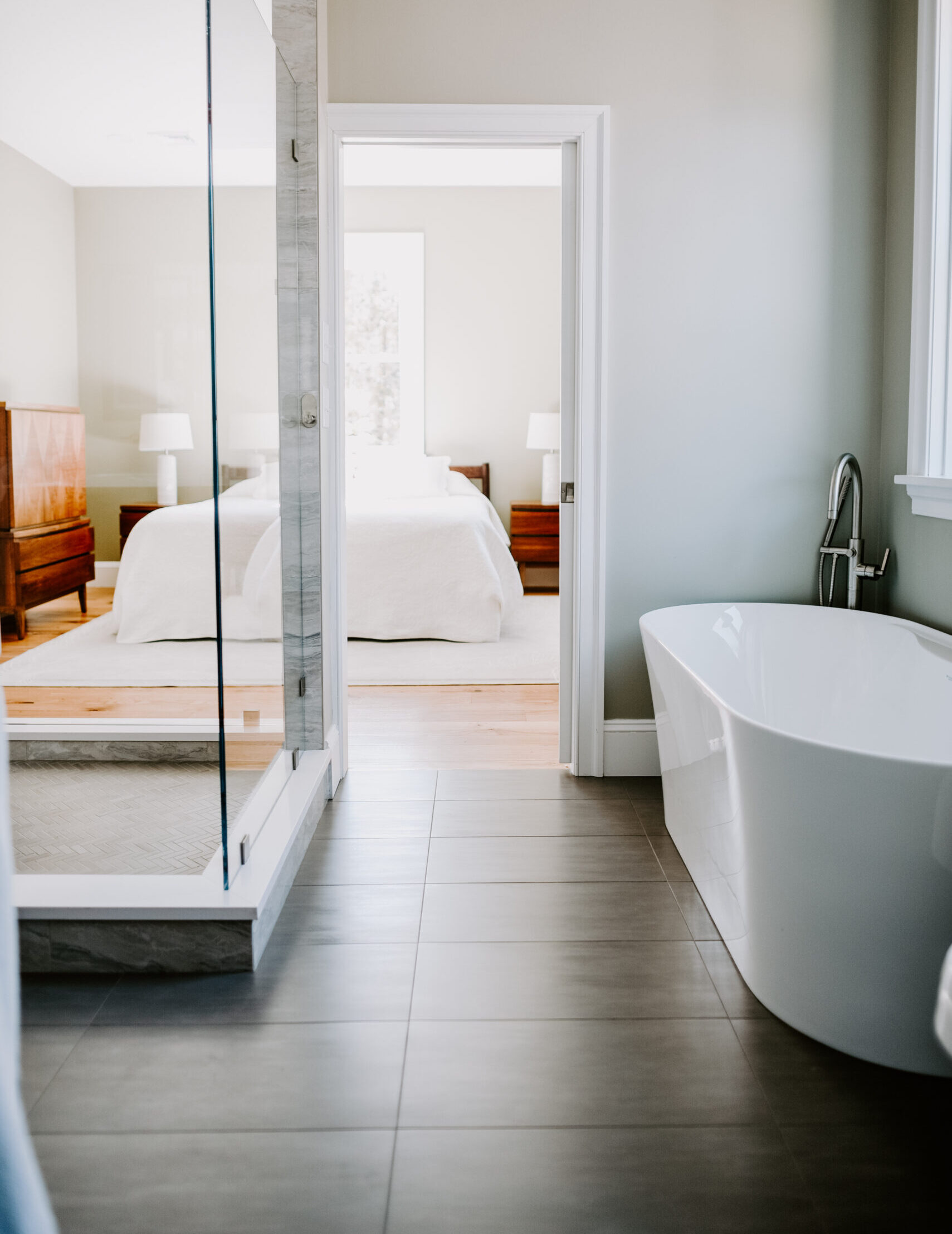 Originally built in the 1800s, we thoughtfully updated this home to enhance both comfort and function while honoring its historic character. We raised the ceiling heights, leveled the floors, and relocated plumbing to create a more open and modern layout. We removed a wall to establish a seamless flow between the primary bedroom and bathroom, highlighted by a glass surround shower wall and a pocket door.
