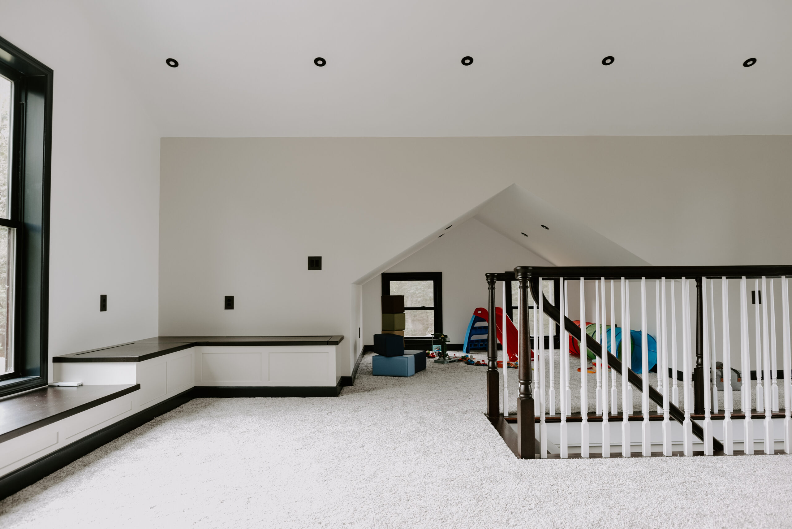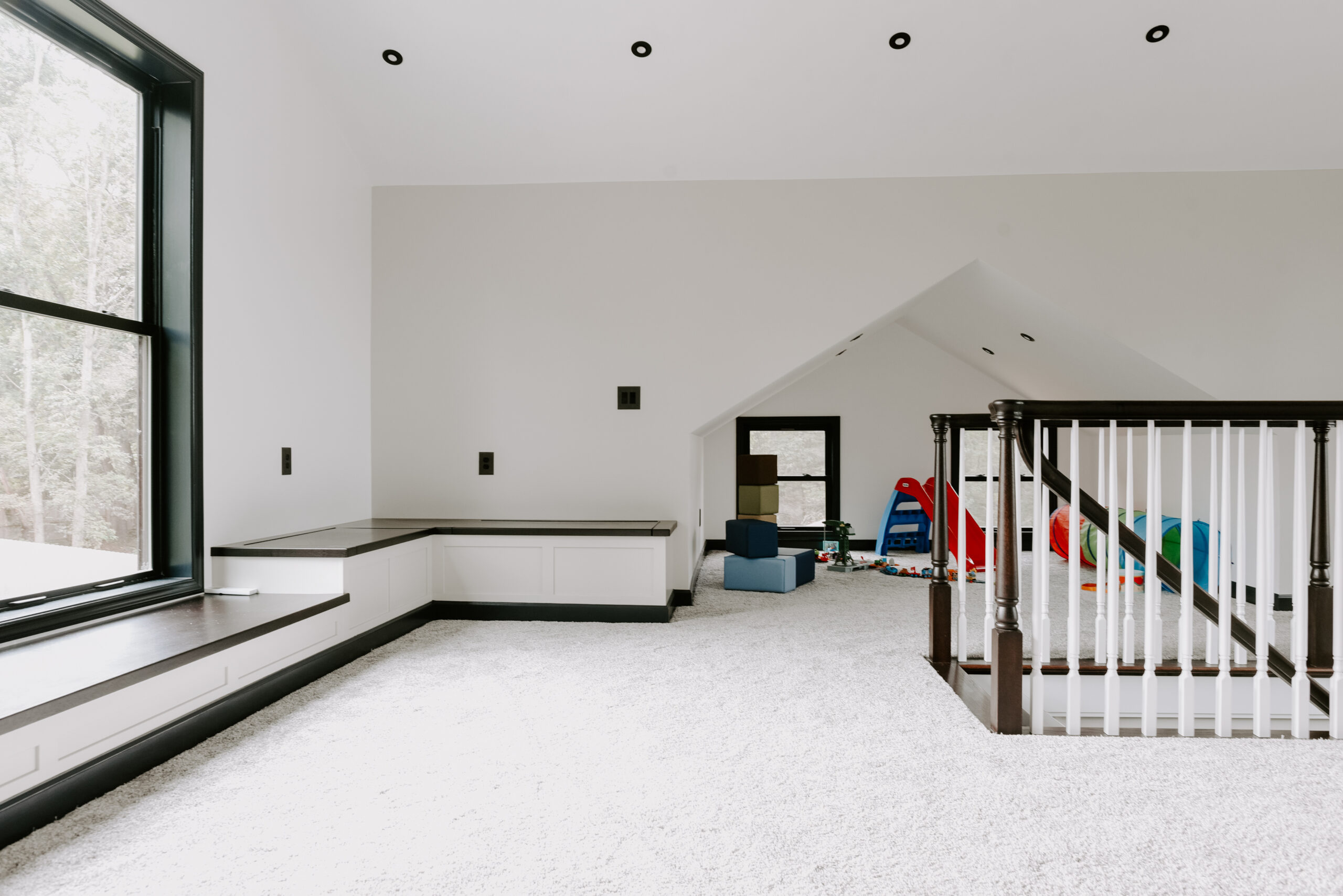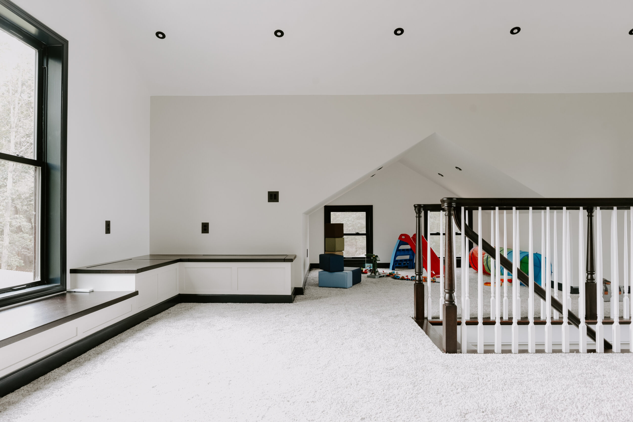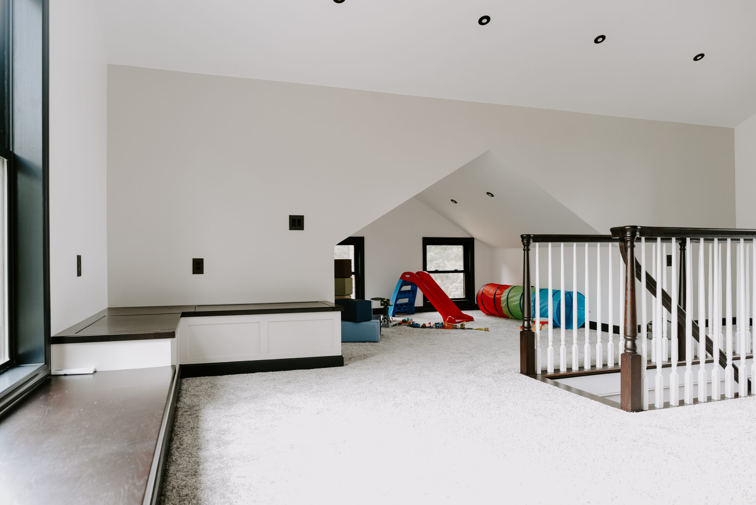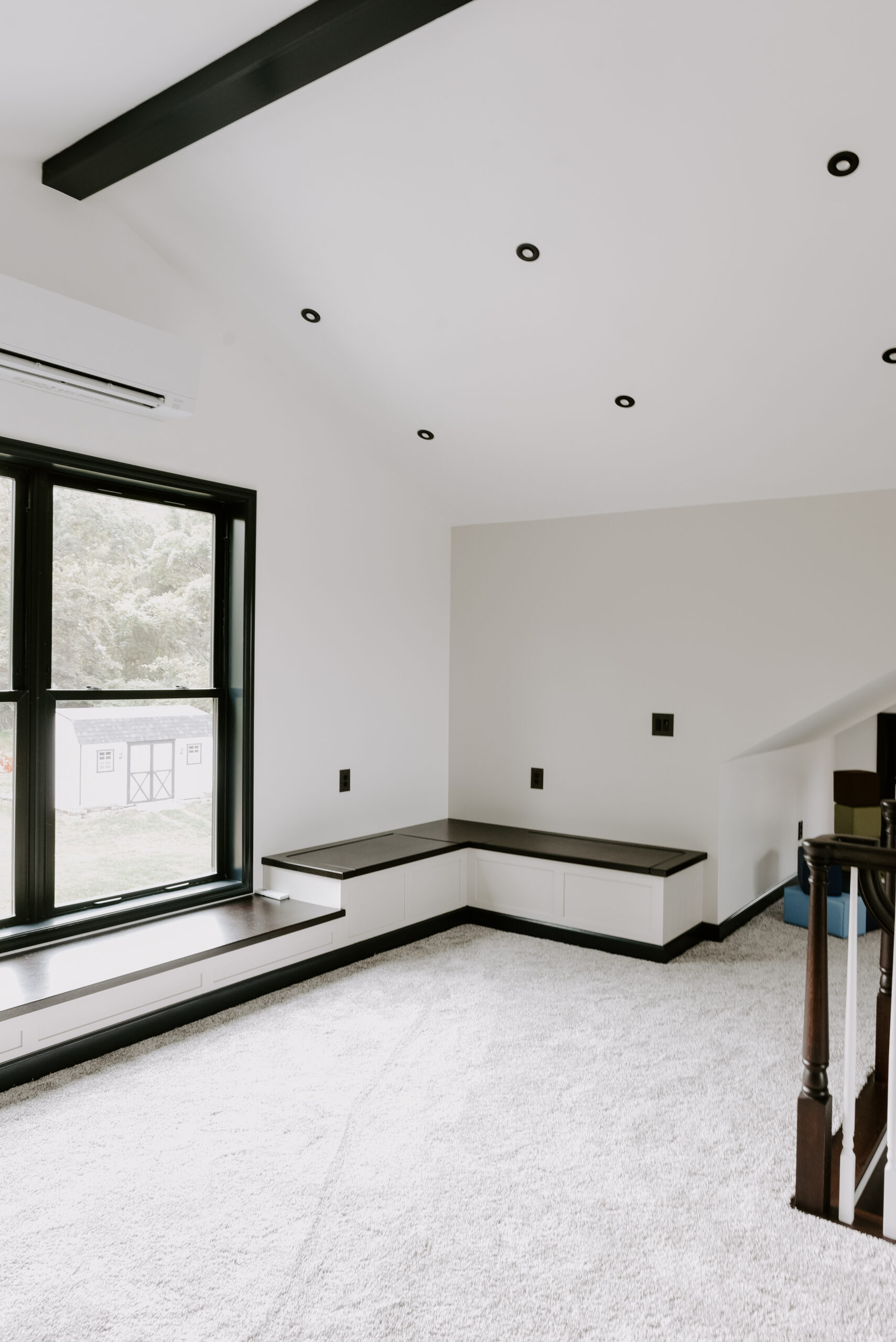 We took an unusable attic space and turned it into a functional third-floor living space. This addition blends seamlessly with the colonial-style home that makes a statement. We tied in the black trim from the rest of the home into this new space, both inside and out. Built-in window bench seating with storage, wood beam accent, and fresh carpet adds that cozy feel. Recessed lighting helps keep things light and bright, no matter what time of day. Two nooks with angled ceiling peaks allow for creating separate spaces to enjoy. Taking what once was just an attic crawl space and turning it into a new extension of their home, for the family to enjoy for years to come.