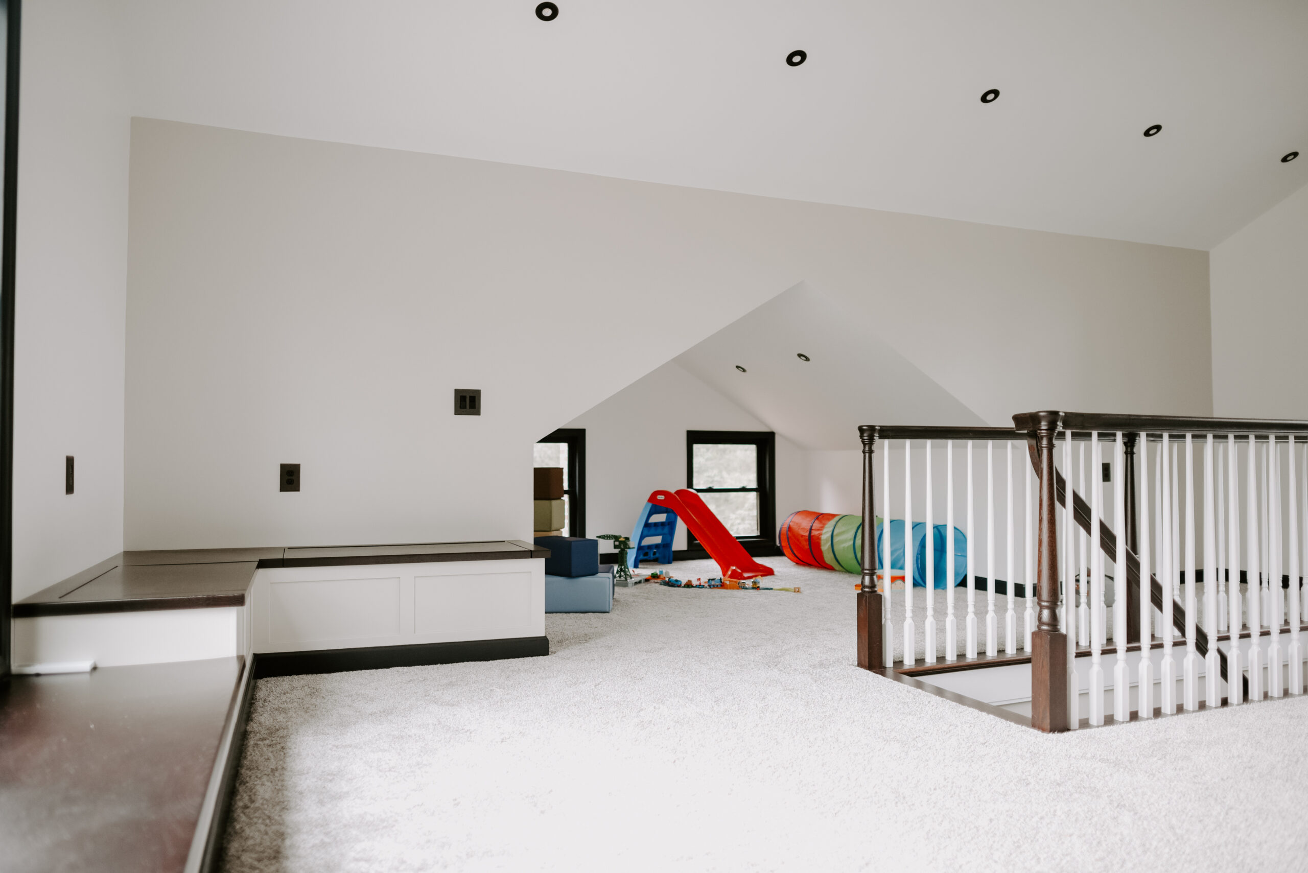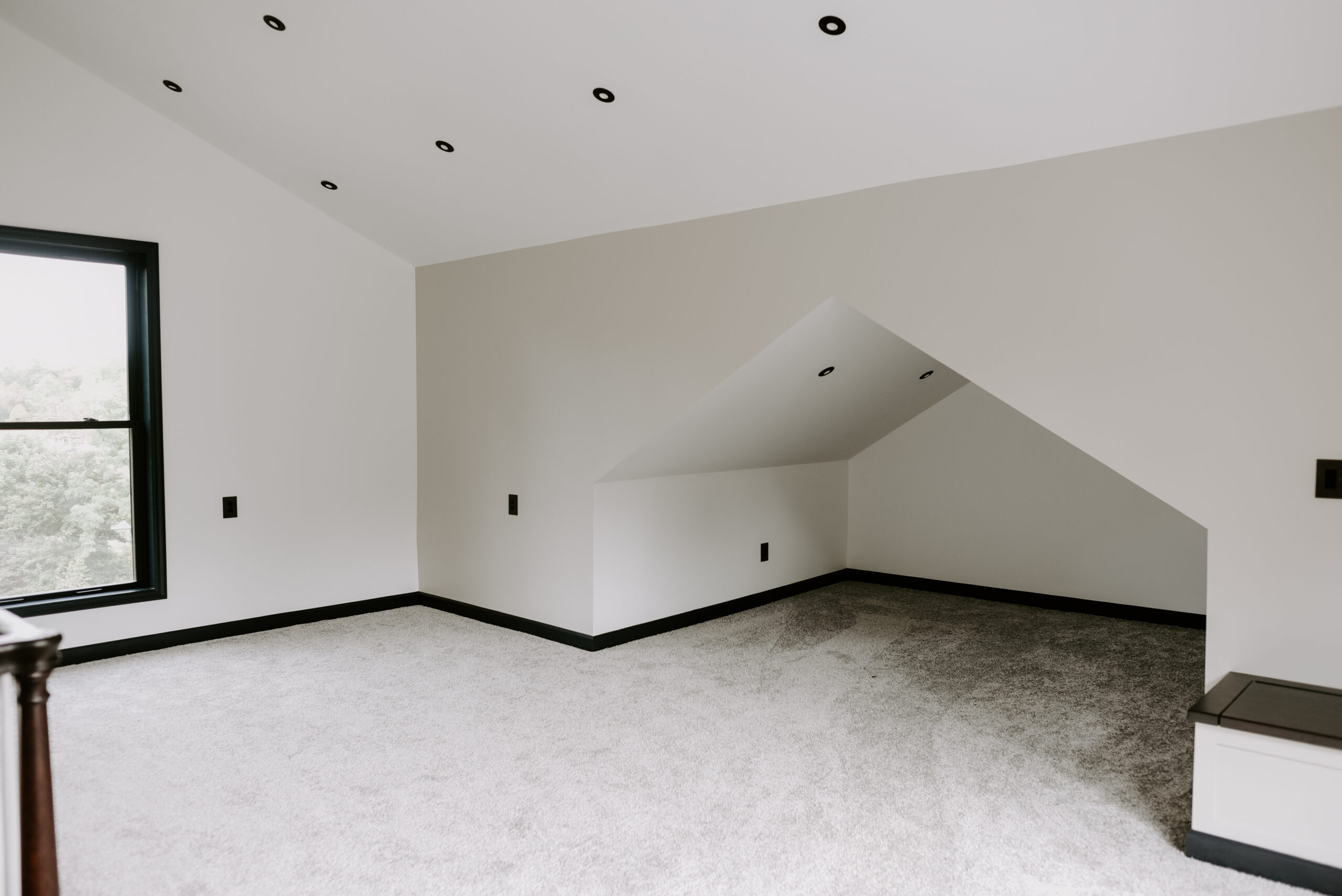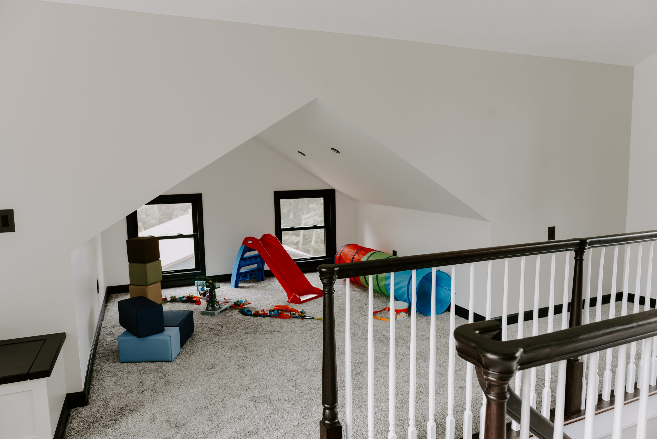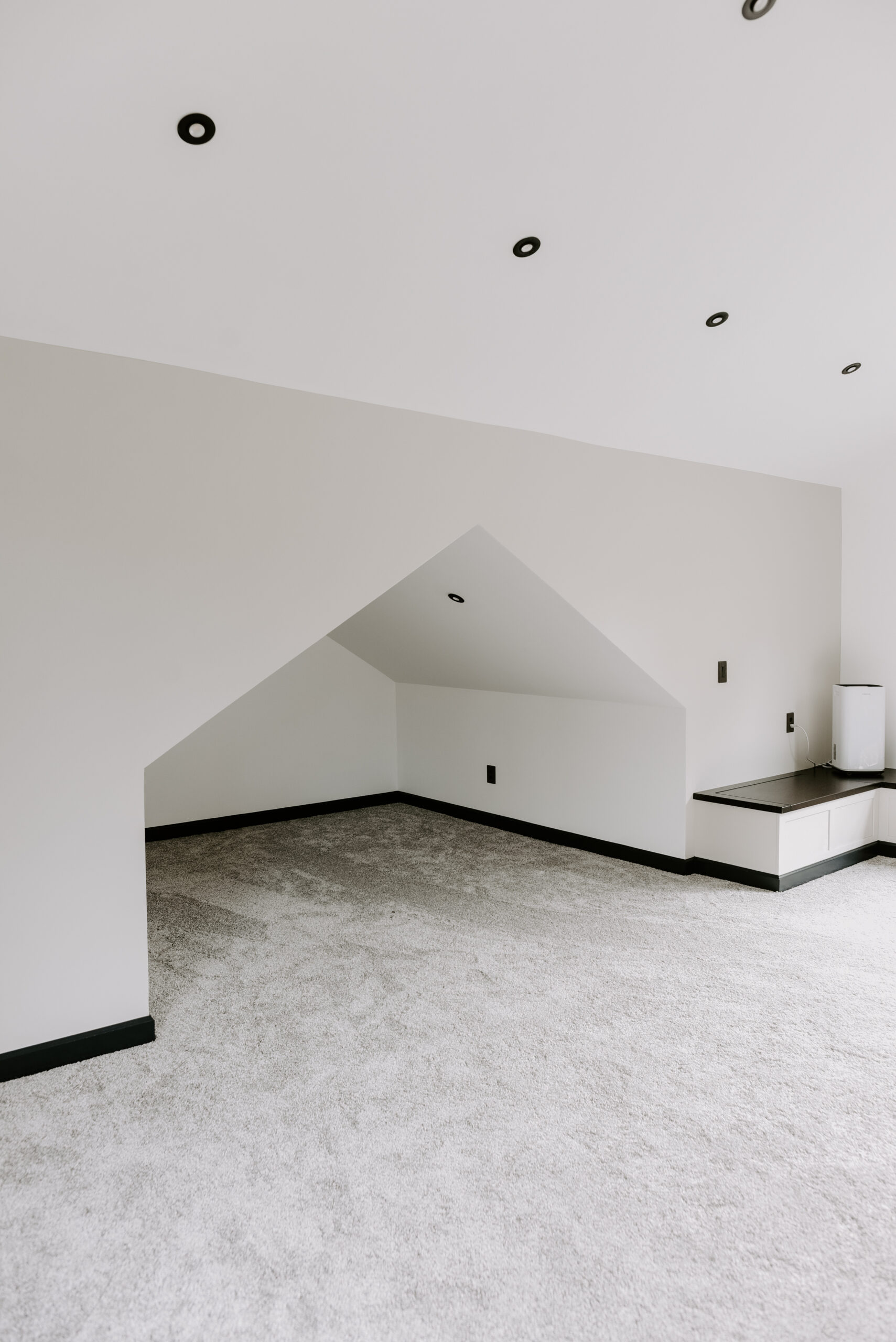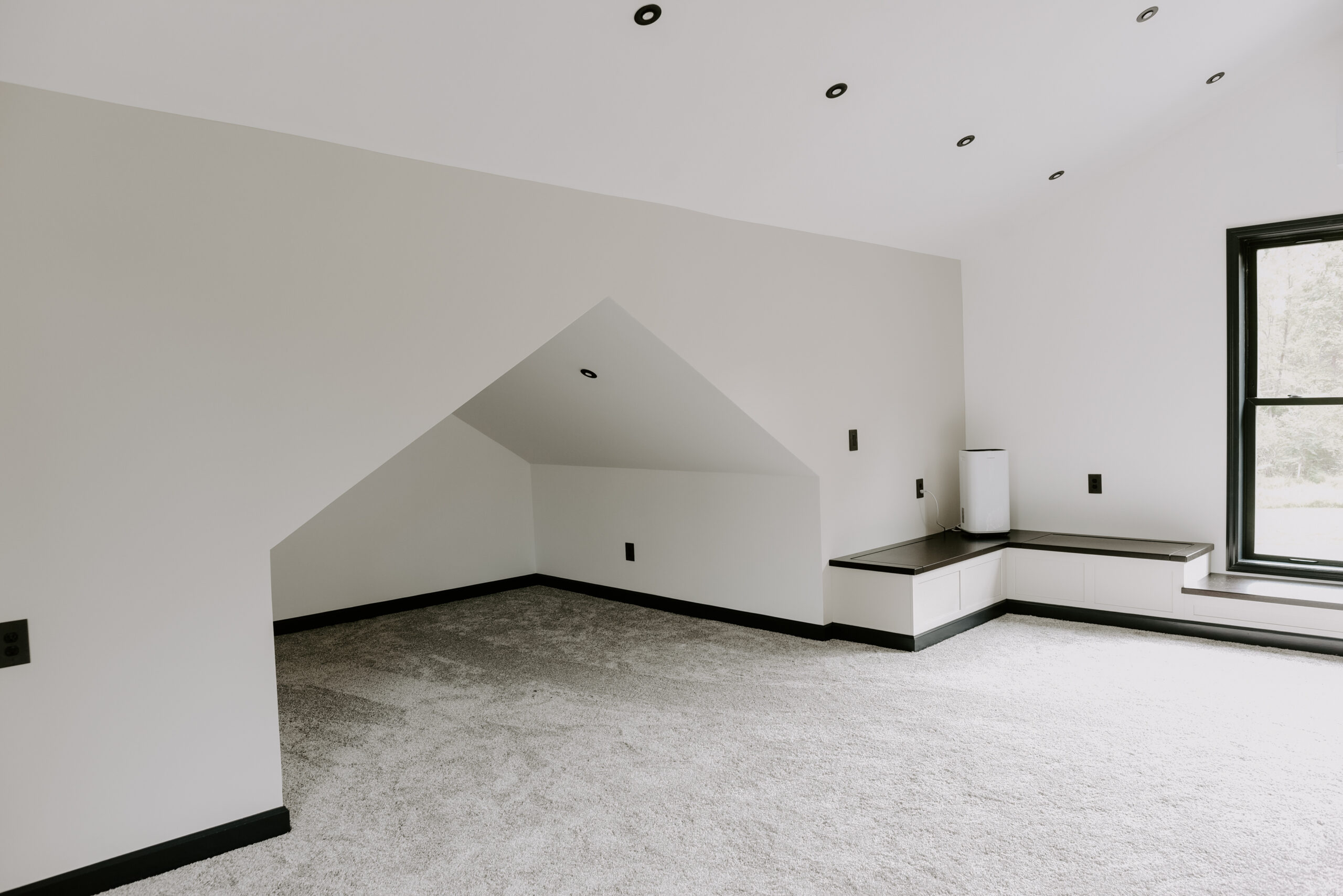 We took an unusable attic space and turned it into a functional third-floor living space. This addition blends seamlessly with the colonial-style home that makes a statement. We tied in the black trim from the rest of the home into this new space, both inside and out. Built-in window bench seating with storage, wood beam accent, and fresh carpet adds that cozy feel. Recessed lighting helps keep things light and bright, no matter what time of day. Two nooks with angled ceiling peaks allow for creating separate spaces to enjoy. Taking what once was just an attic crawl space and turning it into a new extension of their home, for the family to enjoy for years to come.