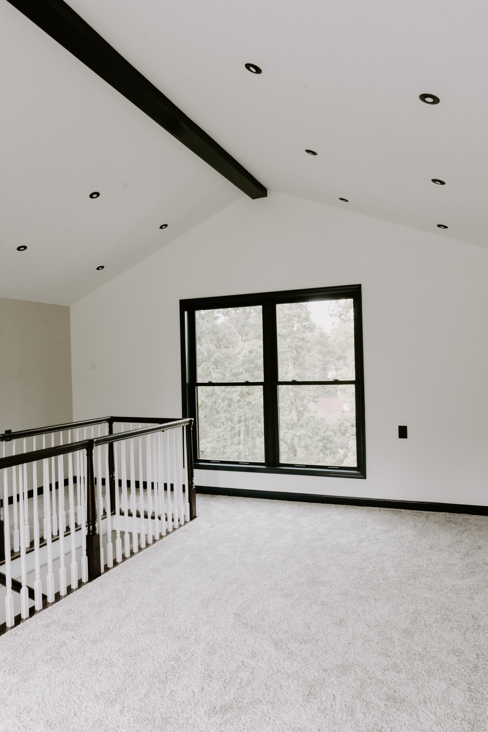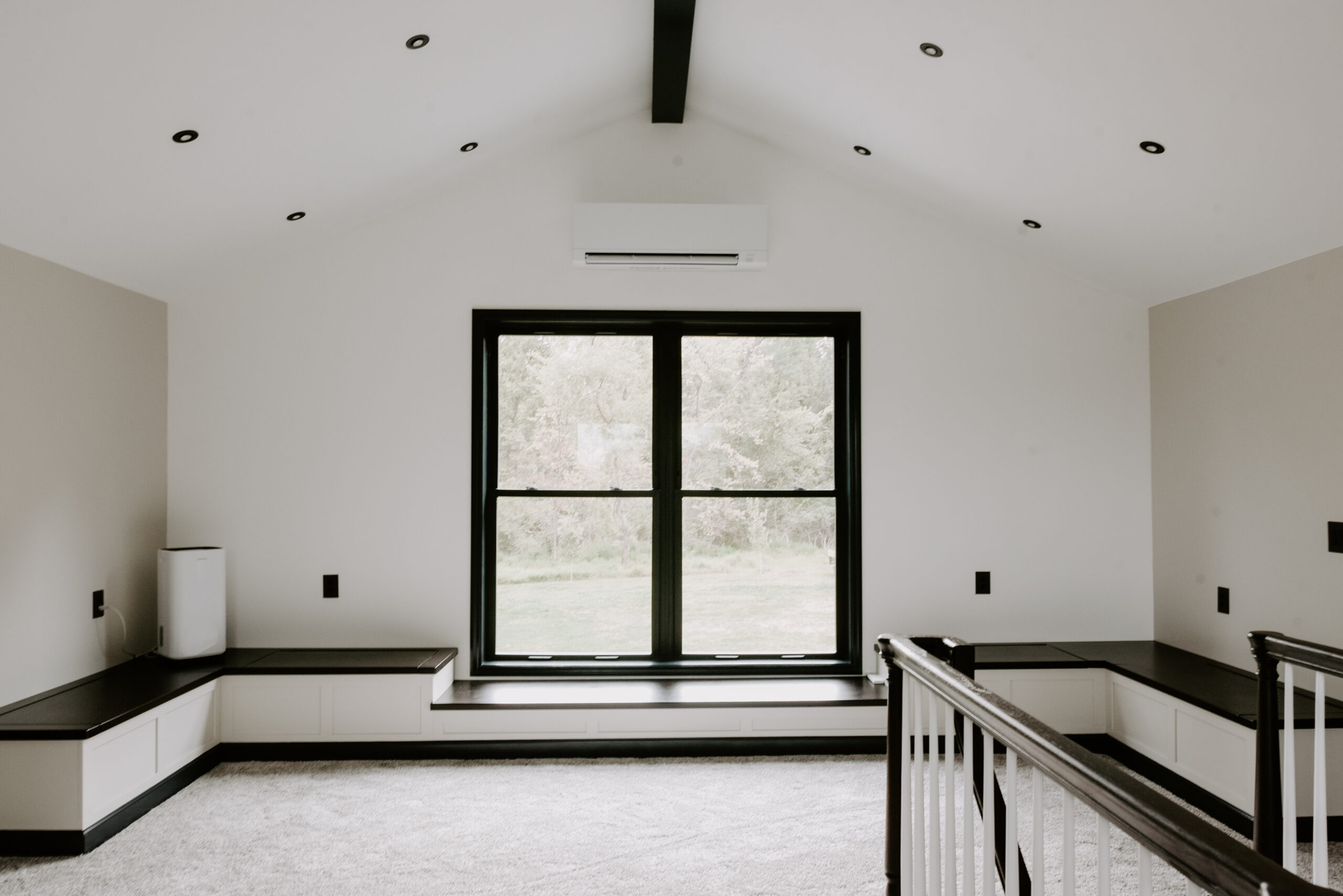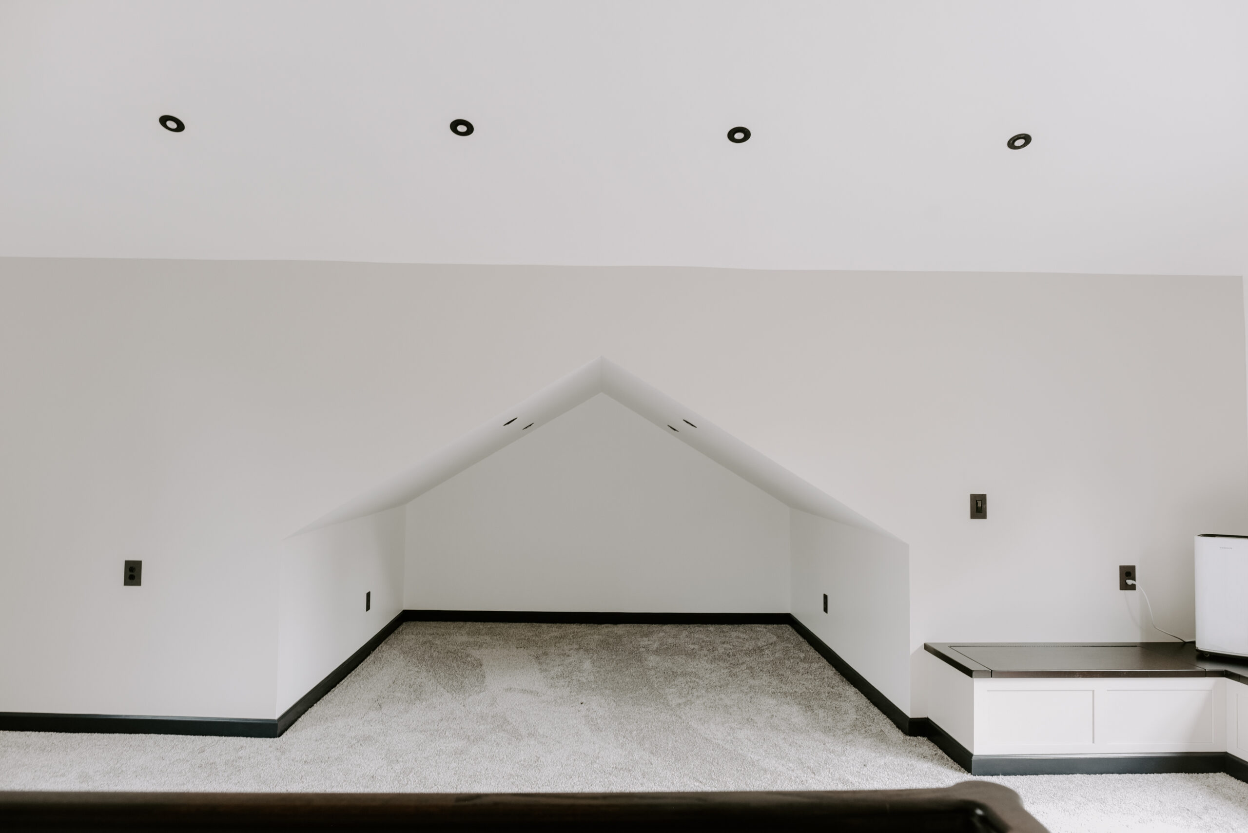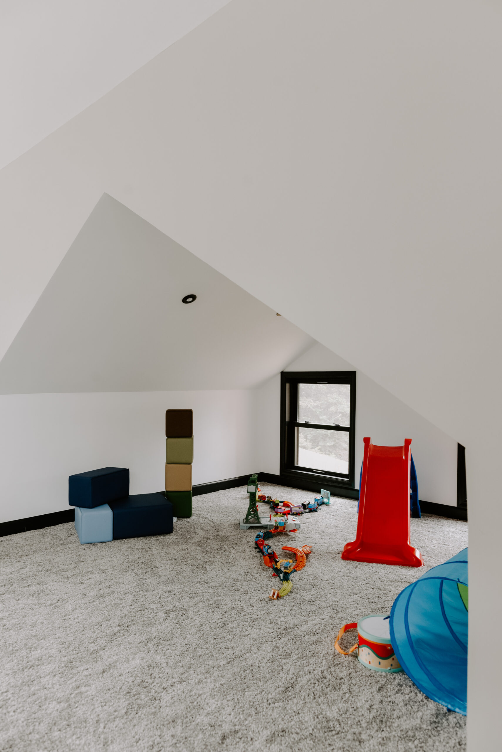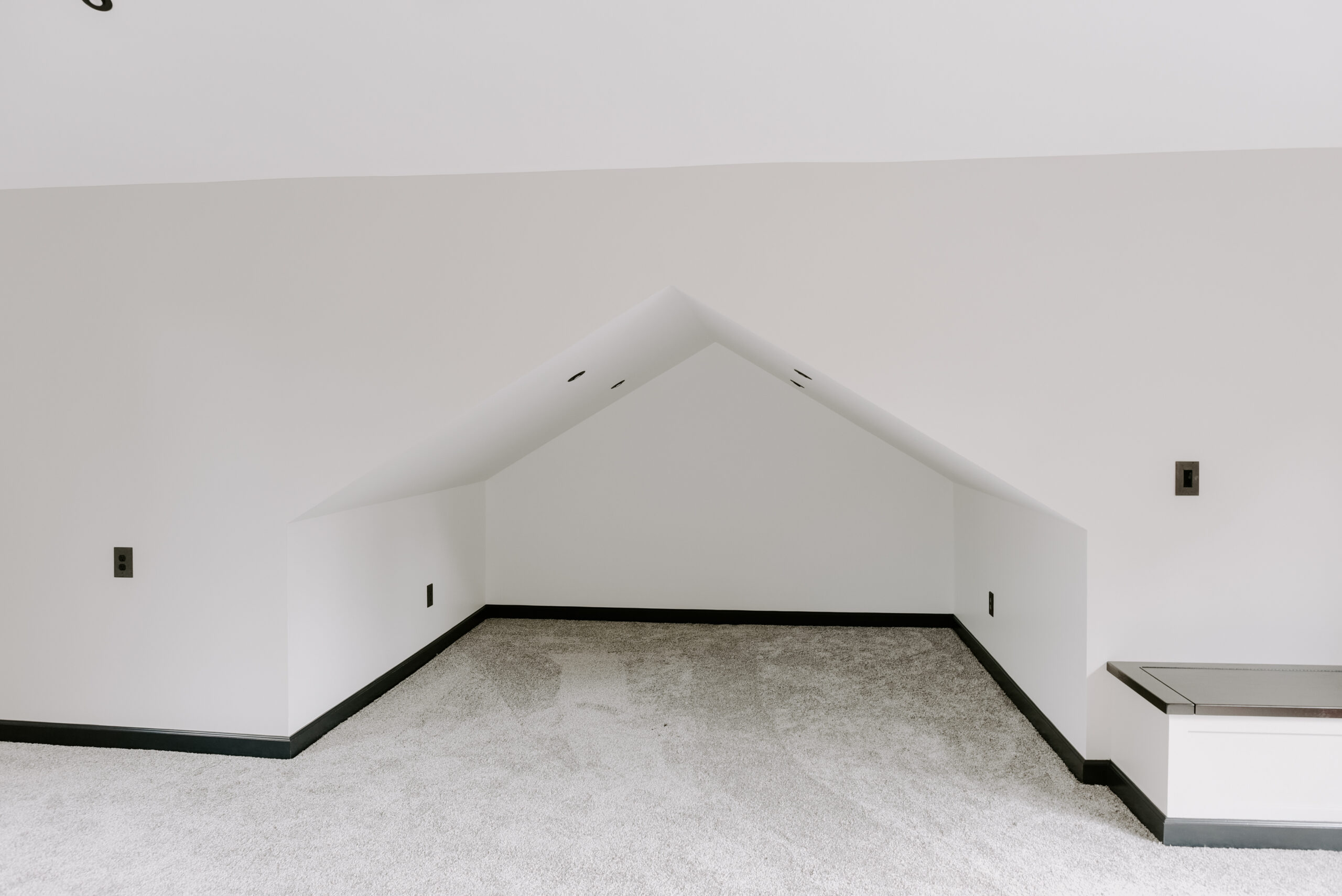 We took an unusable attic space and turned it into a functional third-floor living space. This addition blends seamlessly with the colonial-style home that makes a statement. We tied in the black trim from the rest of the home into this new space, both inside and out. Built-in window bench seating with storage, wood beam accent, and fresh carpet adds that cozy feel. Recessed lighting helps keep things light and bright, no matter what time of day. Two nooks with angled ceiling peaks allow for creating separate spaces to enjoy. Taking what once was just an attic crawl space and turning it into a new extension of their home, for the family to enjoy for years to come.
