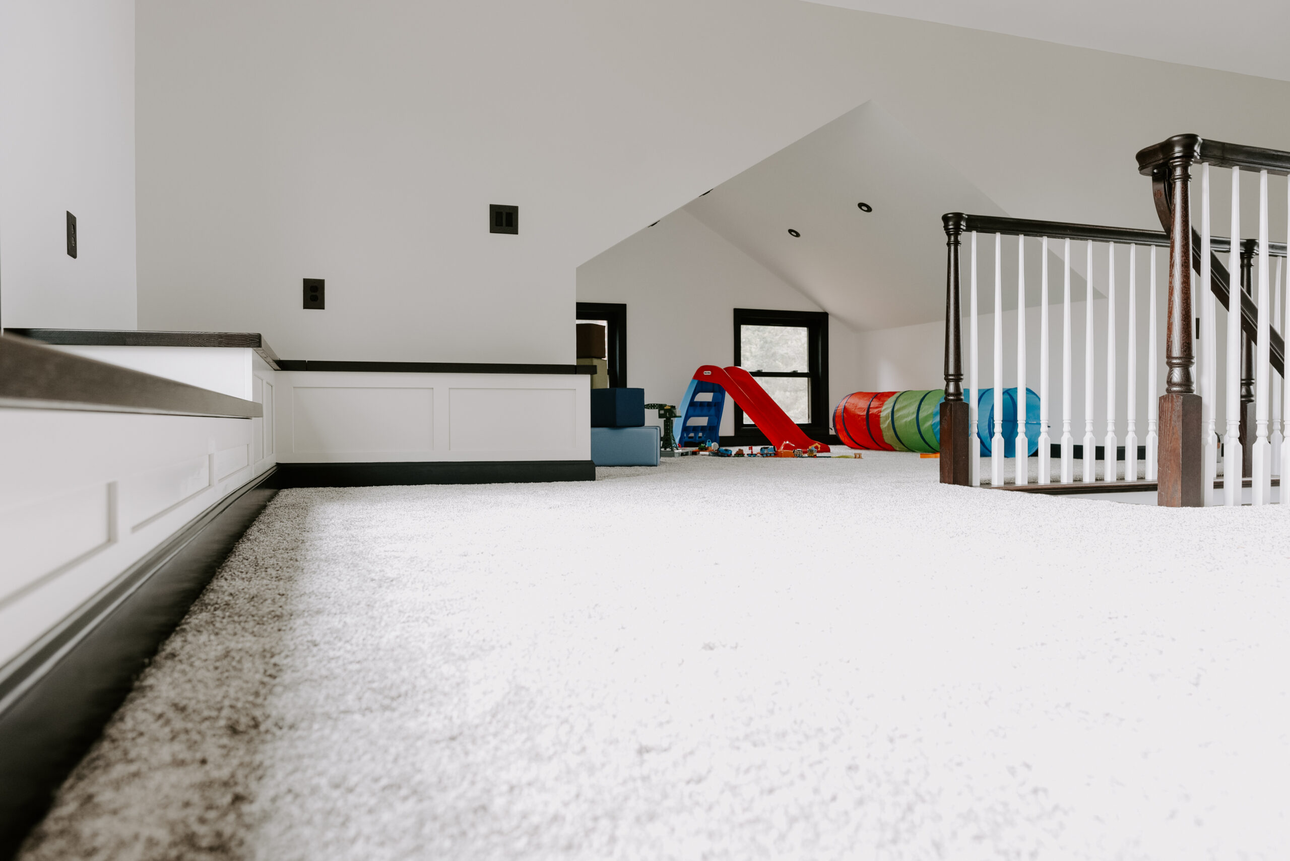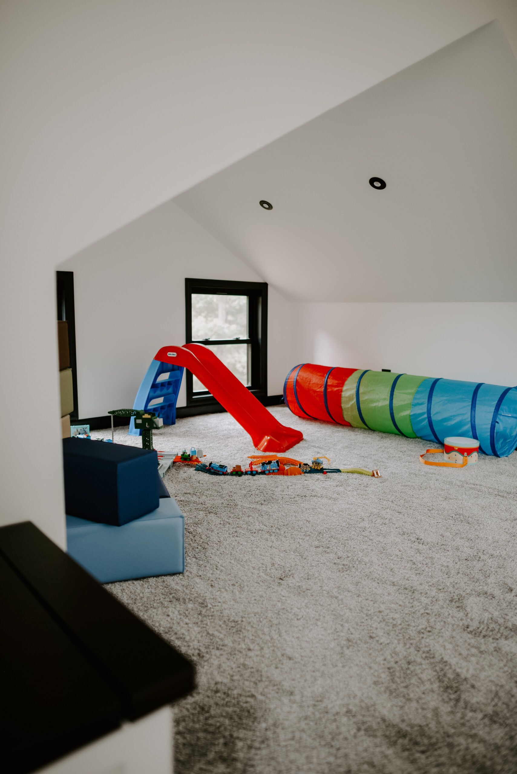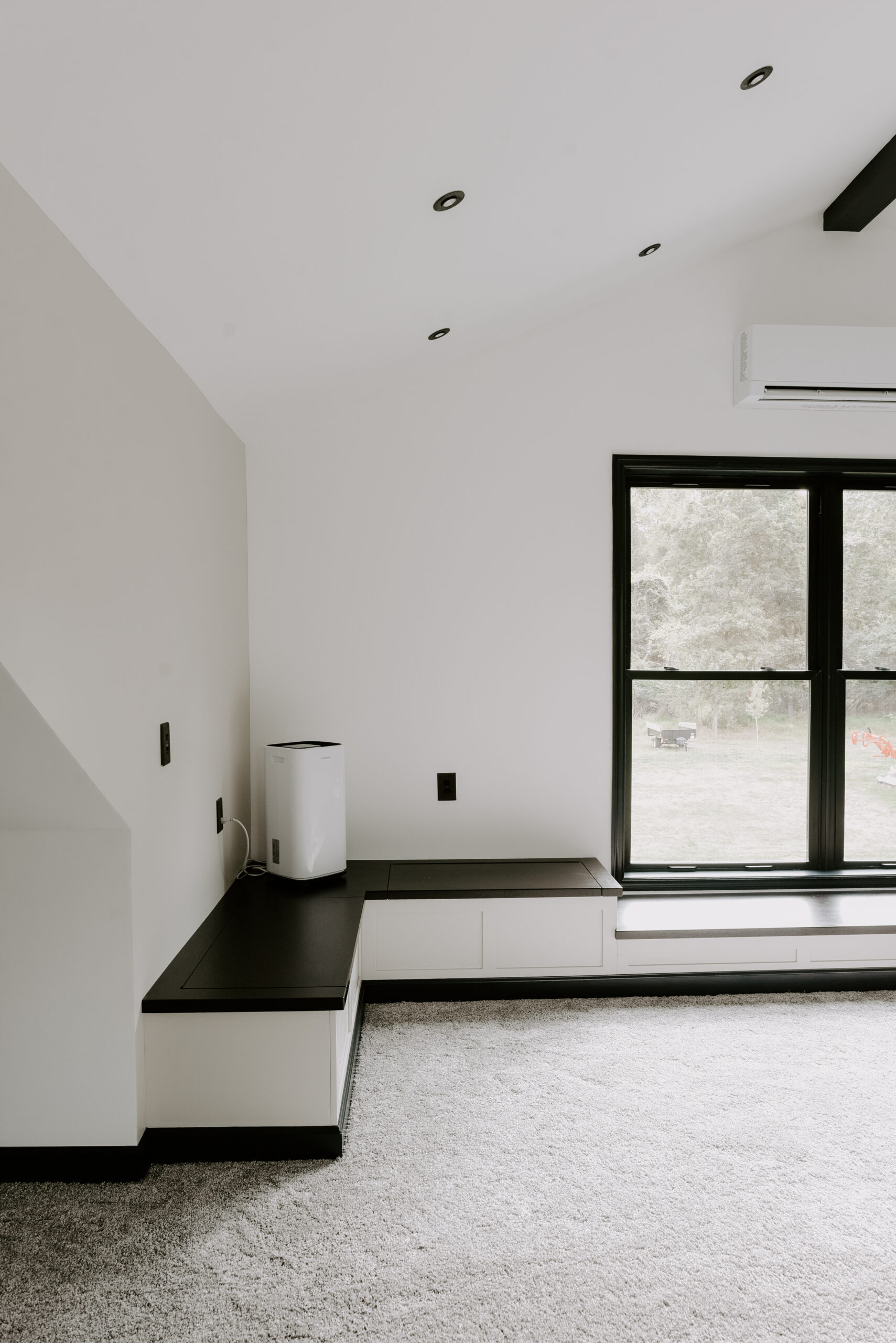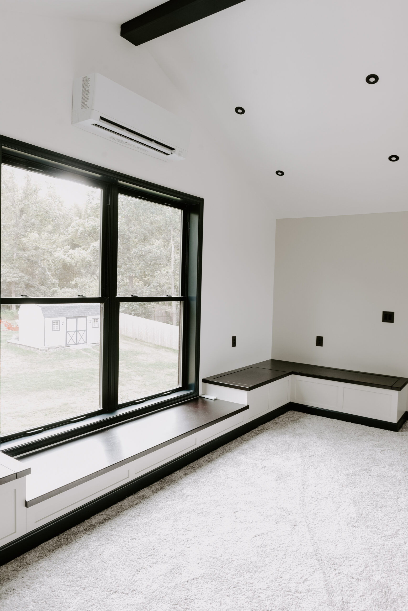 We took an unusable attic space and turned it into a functional third-floor living space. This addition blends seamlessly with the colonial-style home that makes a statement. We tied in the black trim from the rest of the home into this new space, both inside and out. Built-in window bench seating with storage, wood beam accent, and fresh carpet adds that cozy feel. Recessed lighting helps keep things light and bright, no matter what time of day. Two nooks with angled ceiling peaks allow for creating separate spaces to enjoy. Taking what once was just an attic crawl space and turning it into a new extension of their home, for the family to enjoy for years to come.