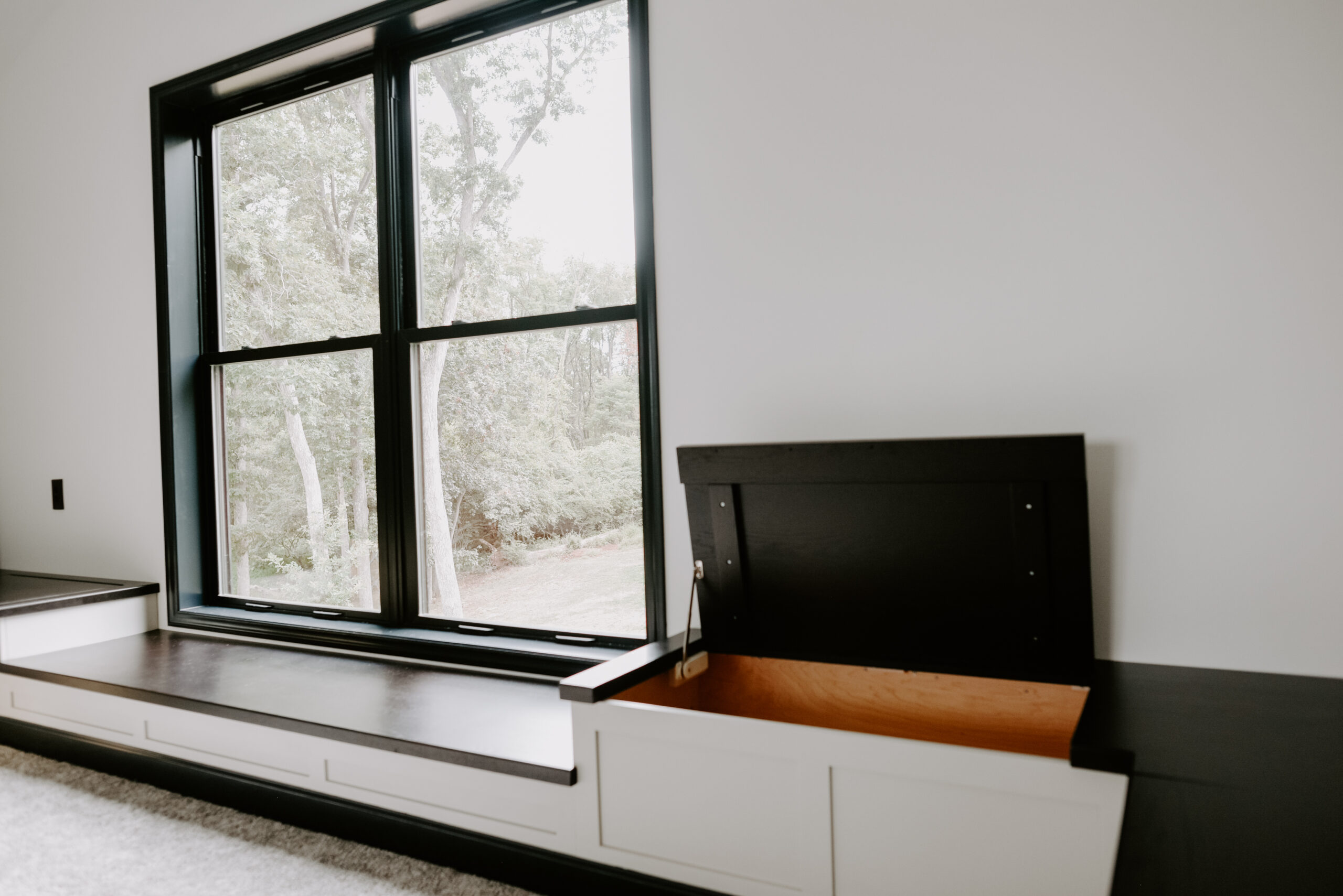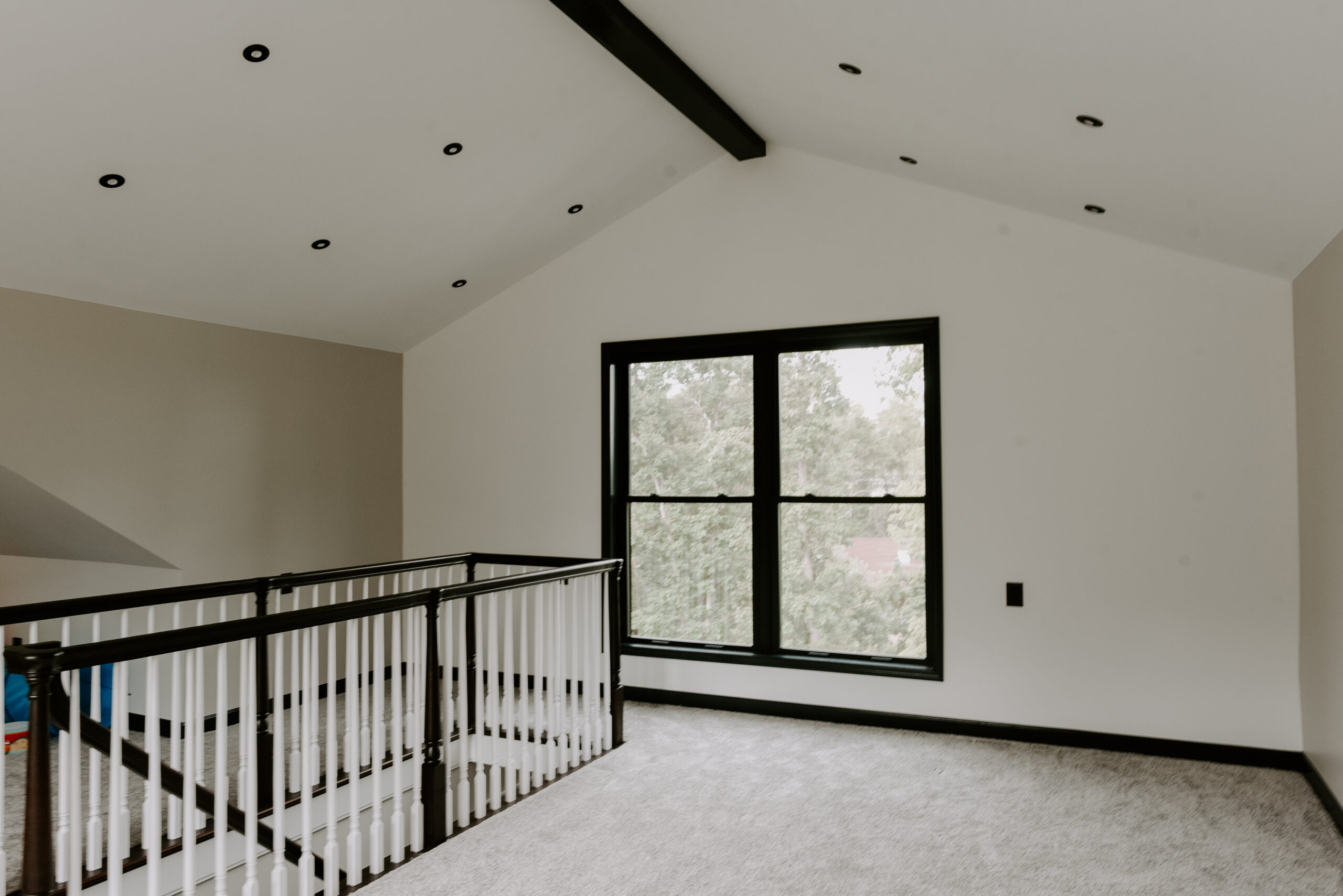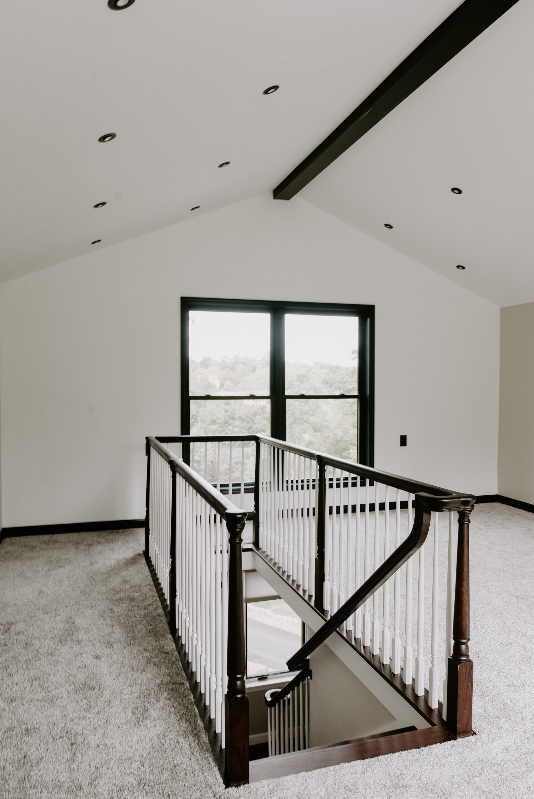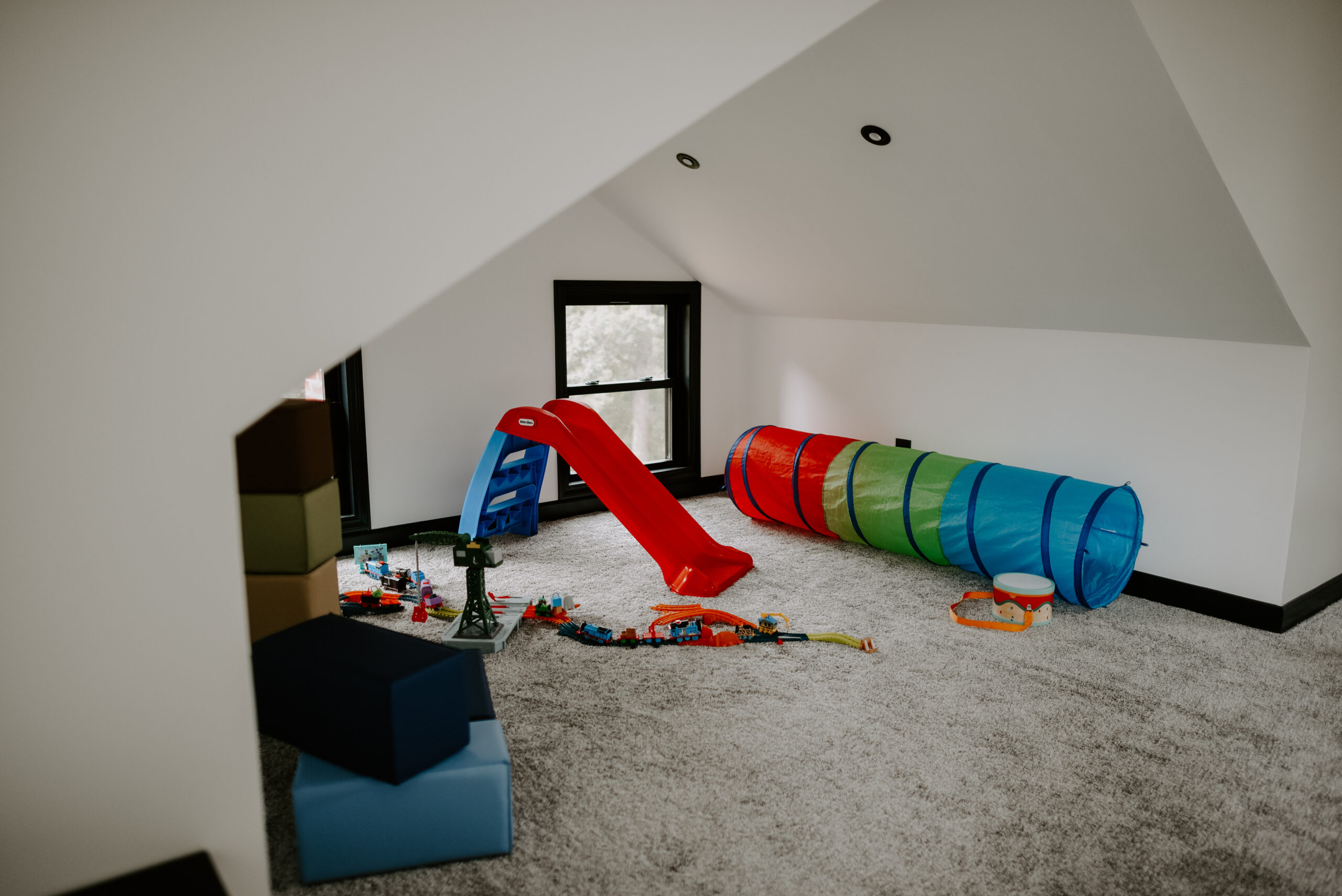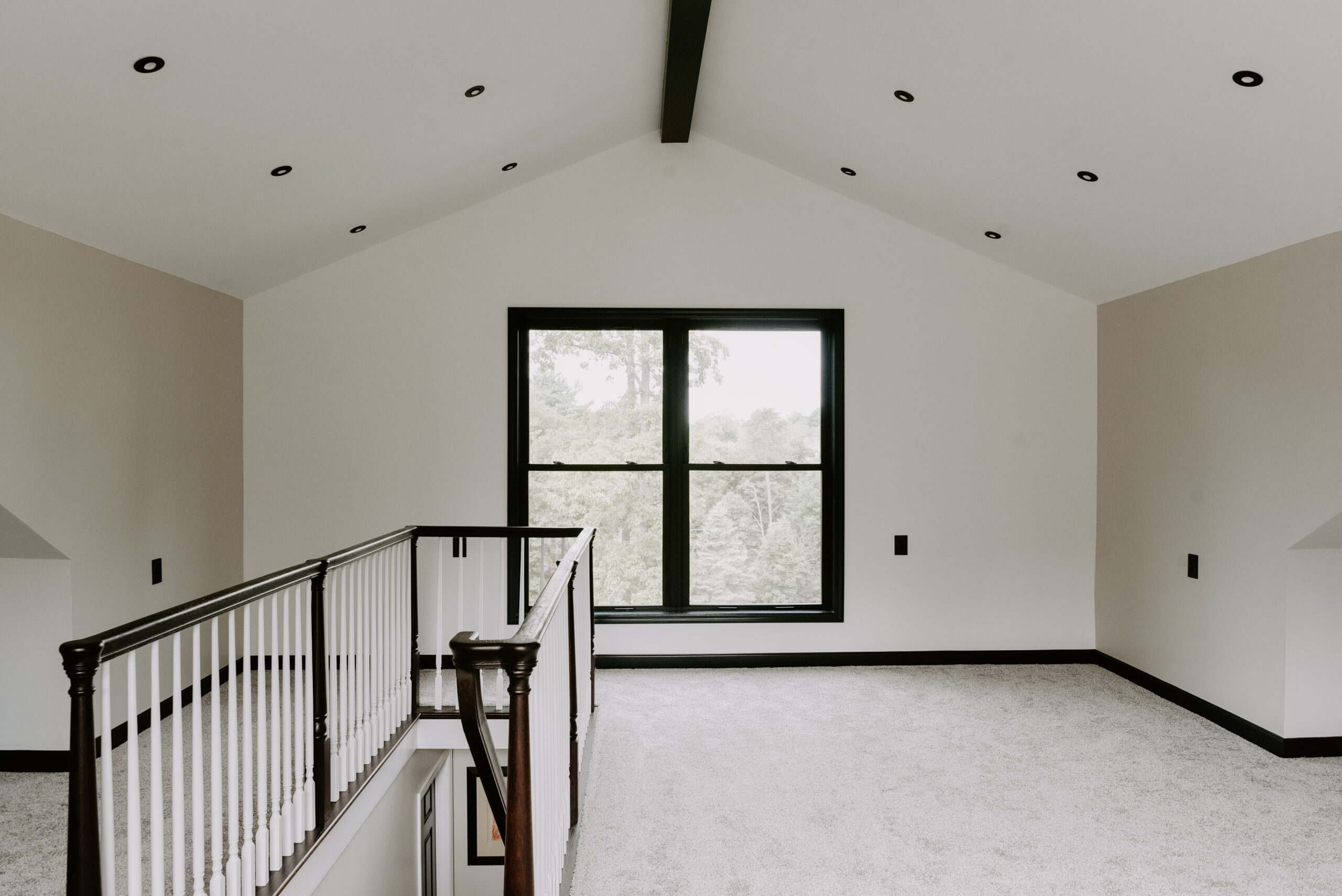 We took an unusable attic space and turned it into a functional third-floor living space. This addition blends seamlessly with the colonial-style home that makes a statement. We tied in the black trim from the rest of the home into this new space, both inside and out. Built-in window bench seating with storage, wood beam accent, and fresh carpet adds that cozy feel. Recessed lighting helps keep things light and bright, no matter what time of day. Two nooks with angled ceiling peaks allow for creating separate spaces to enjoy. Taking what once was just an attic crawl space and turning it into a new extension of their home, for the family to enjoy for years to come.