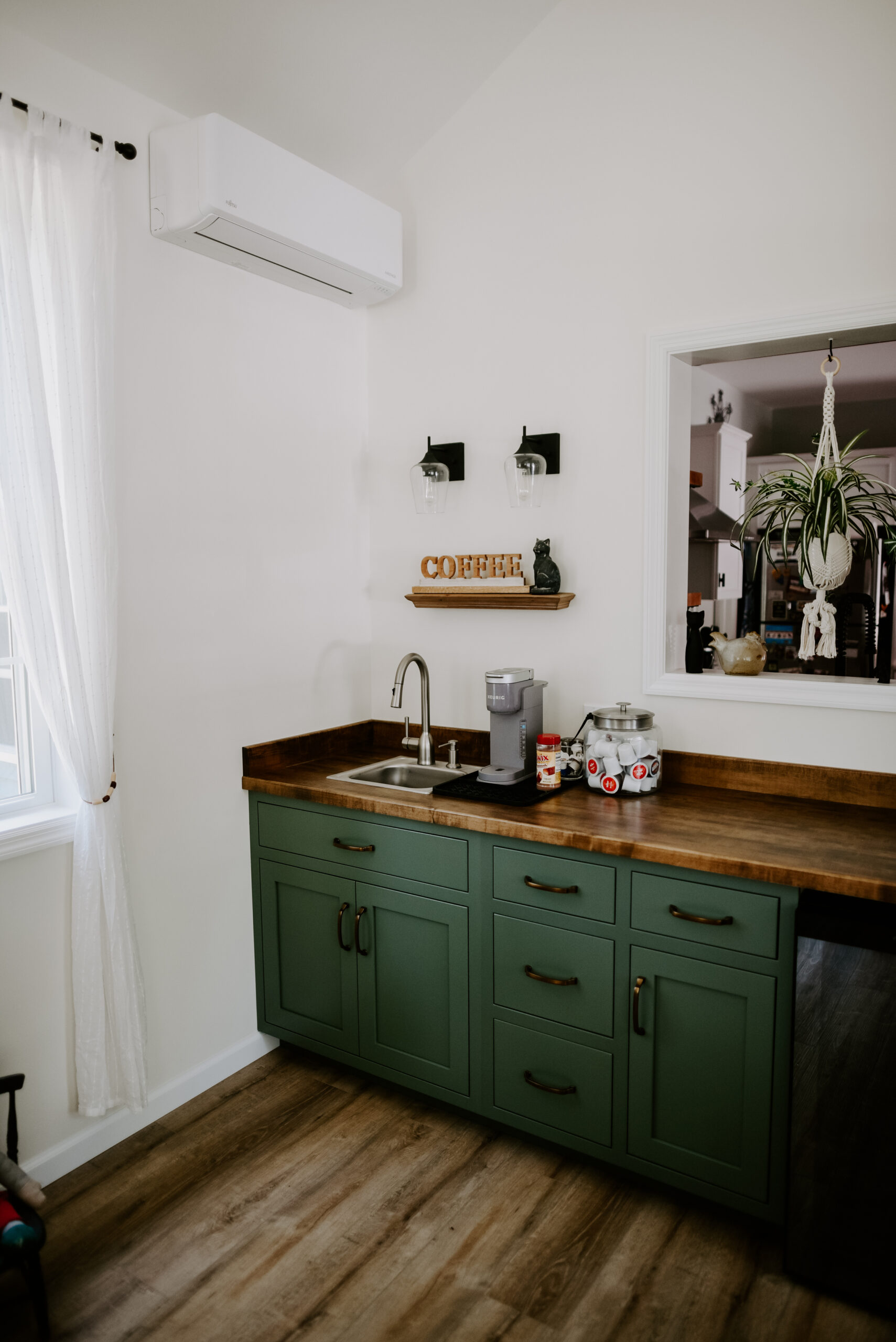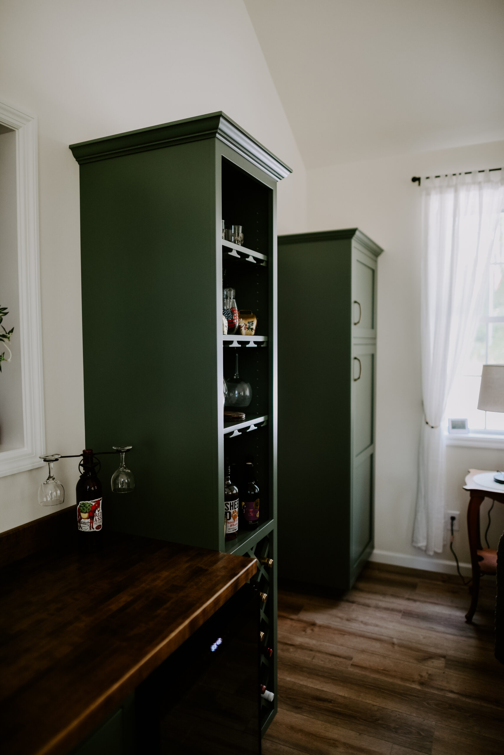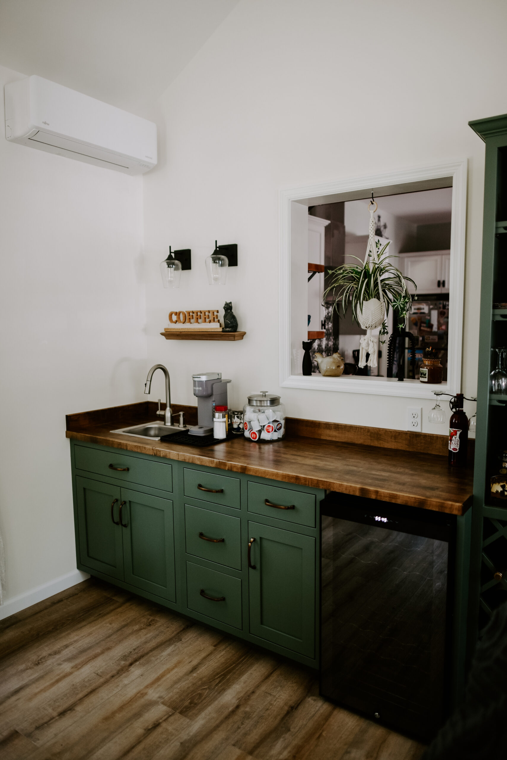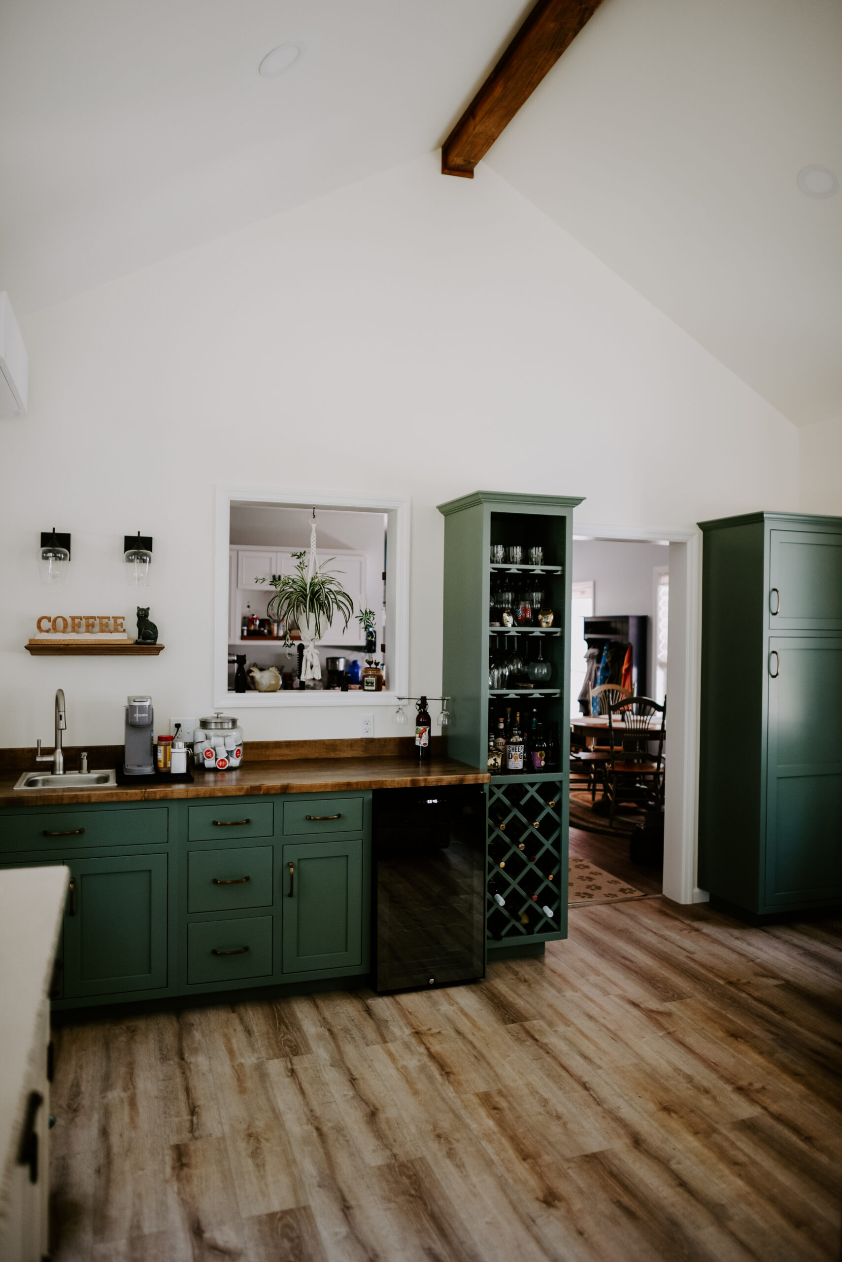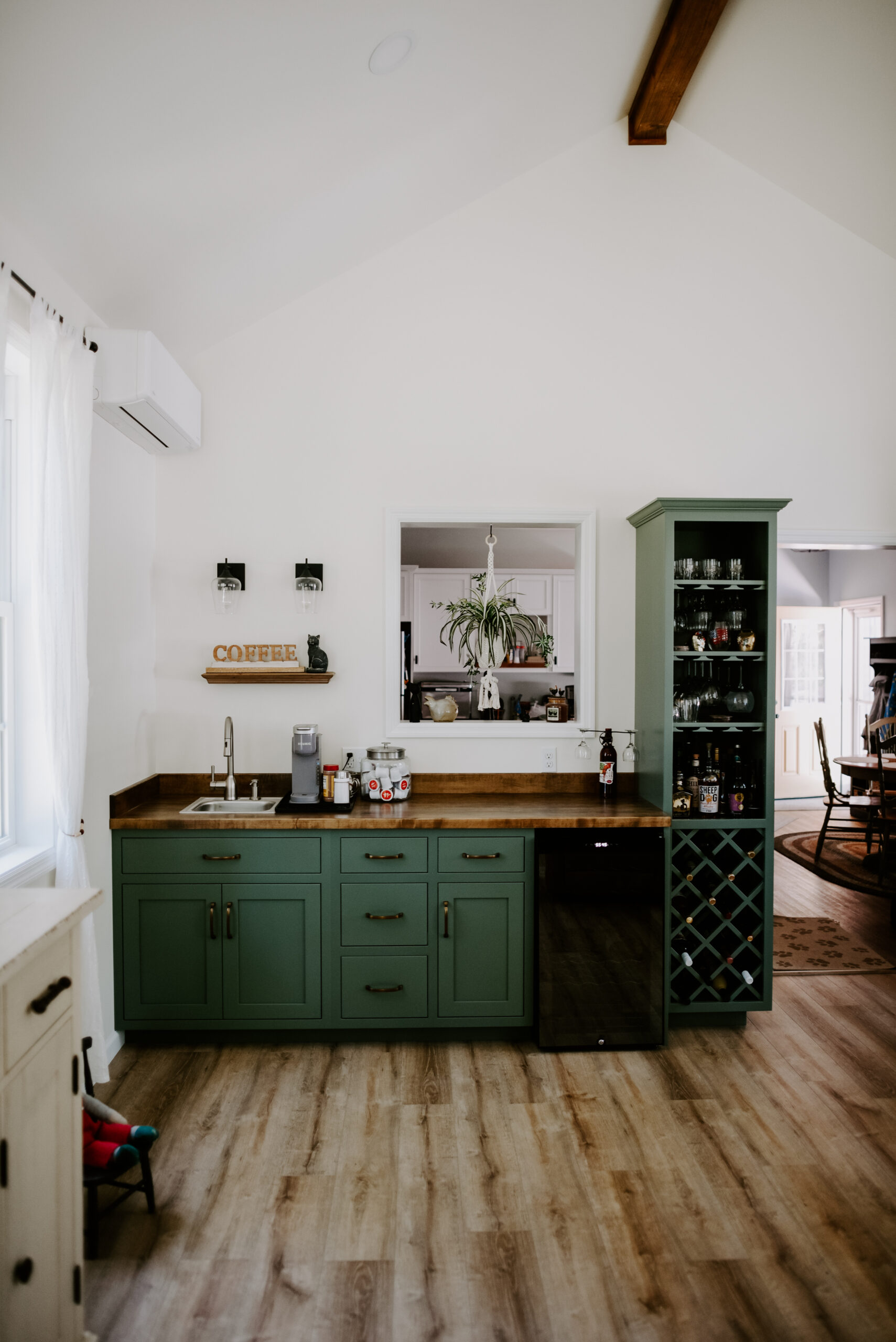 Cozy cottage addition for this homeowner with a custom kitchenette, featuring wine storage and coffee bar and custom cabinets with wood countertops and LVP flooring. Window opening from the kitchen and doorway into the dining room tie both spaces beautifully together with this new addition. Shiplap accent wall behind a wood-burning stove, wooden mantle and wood beam carries the cozy cottage design throughout this space.