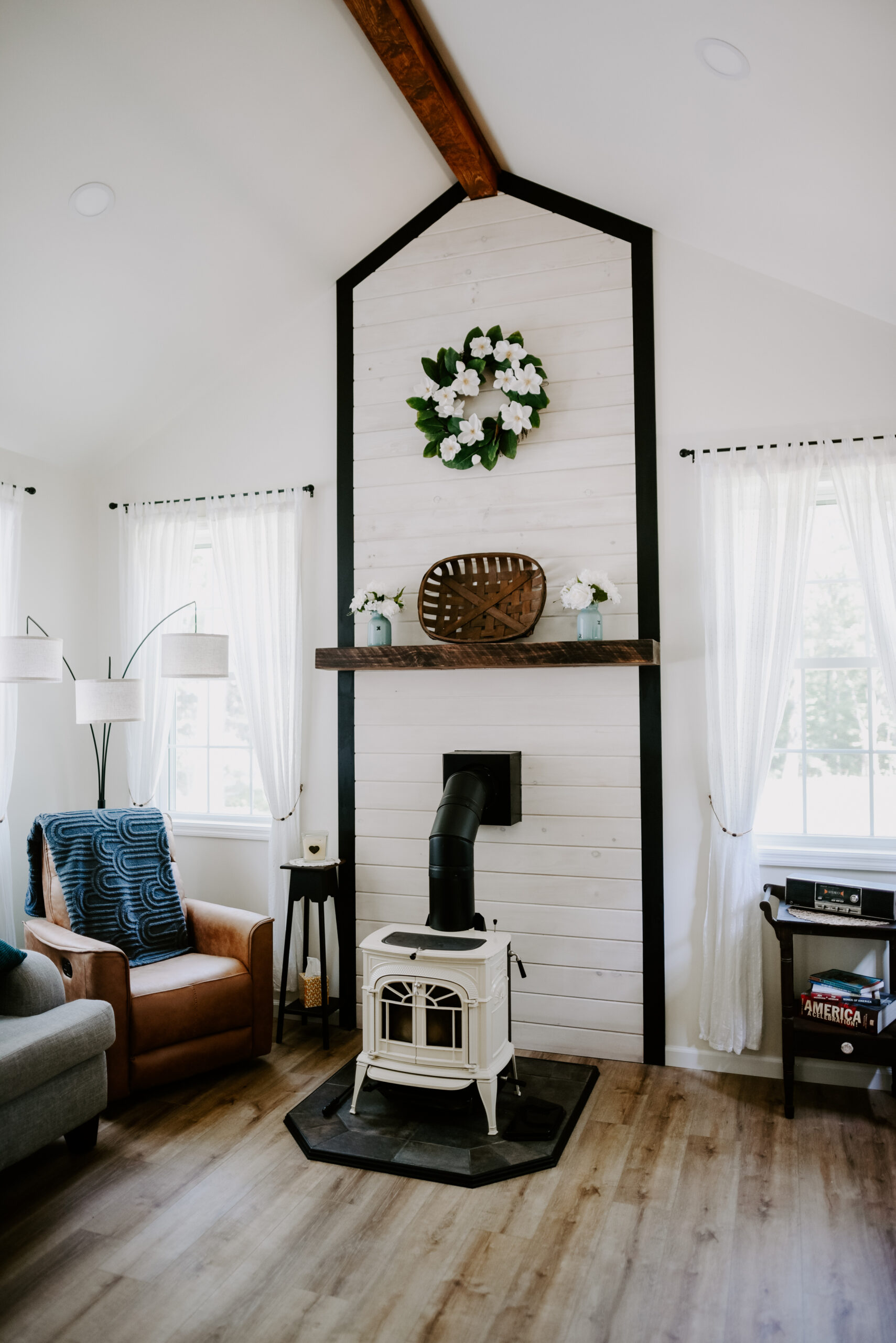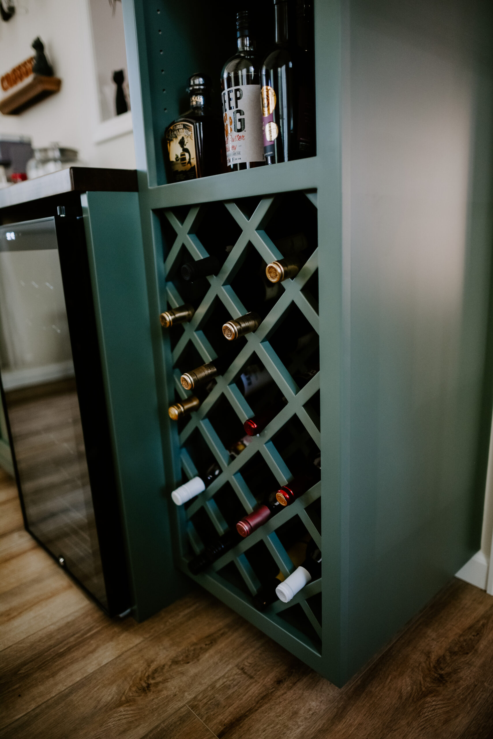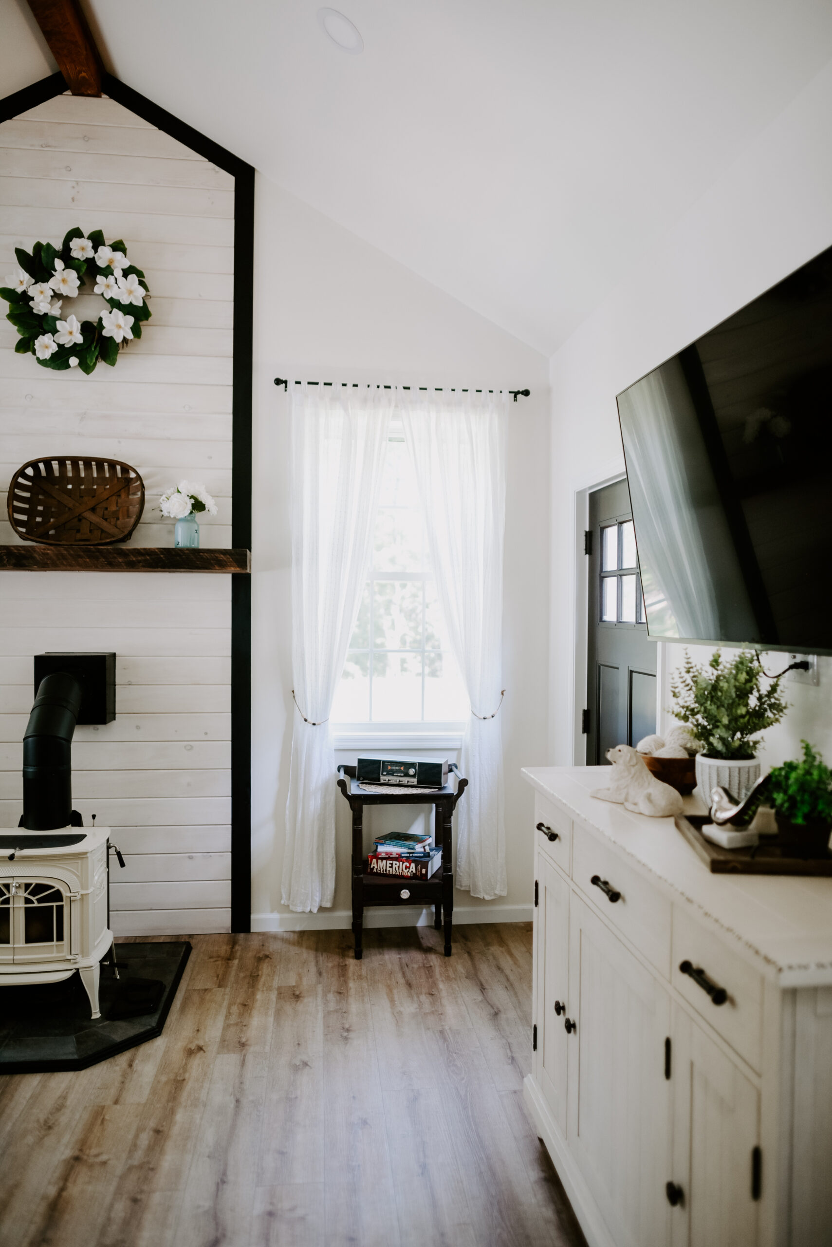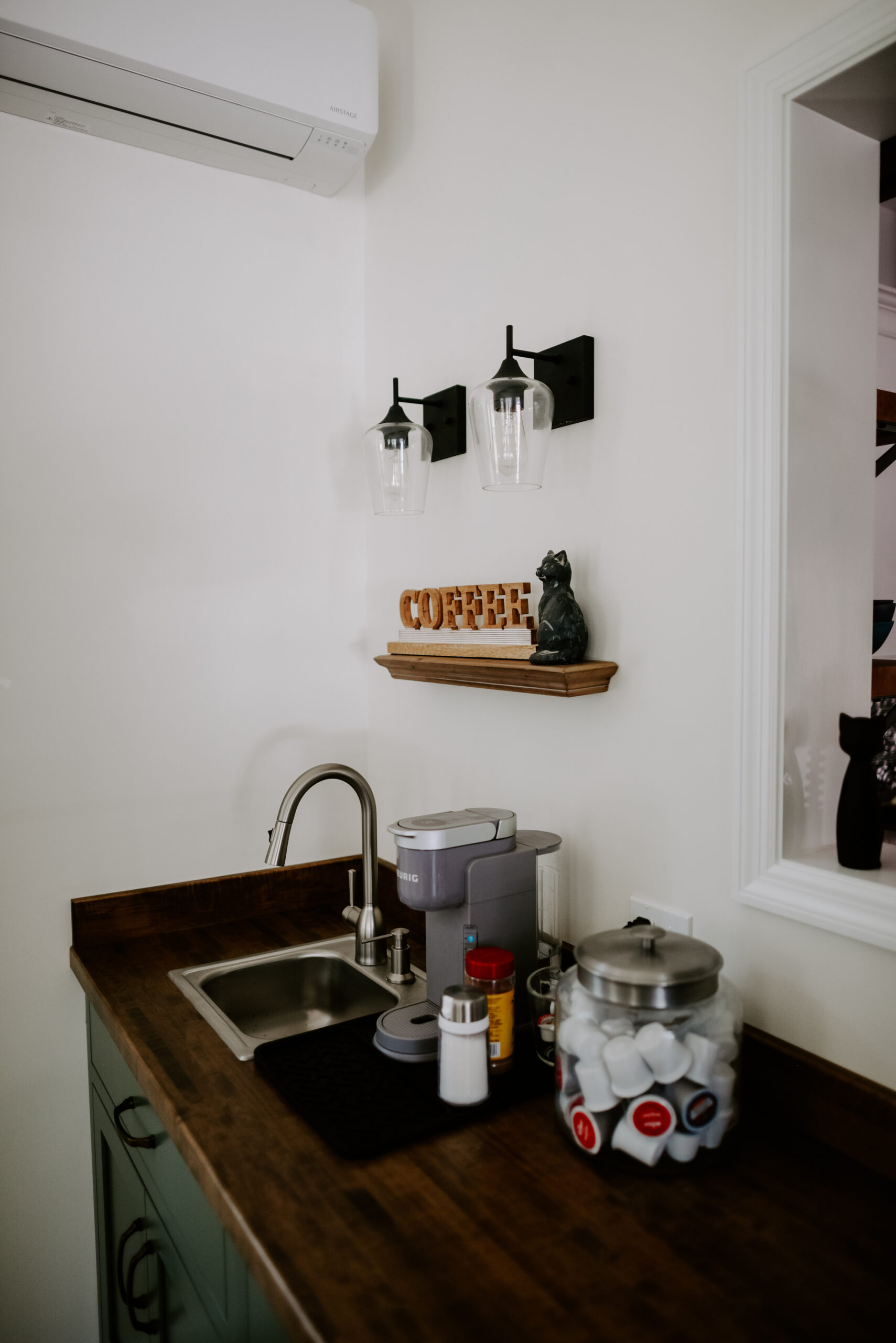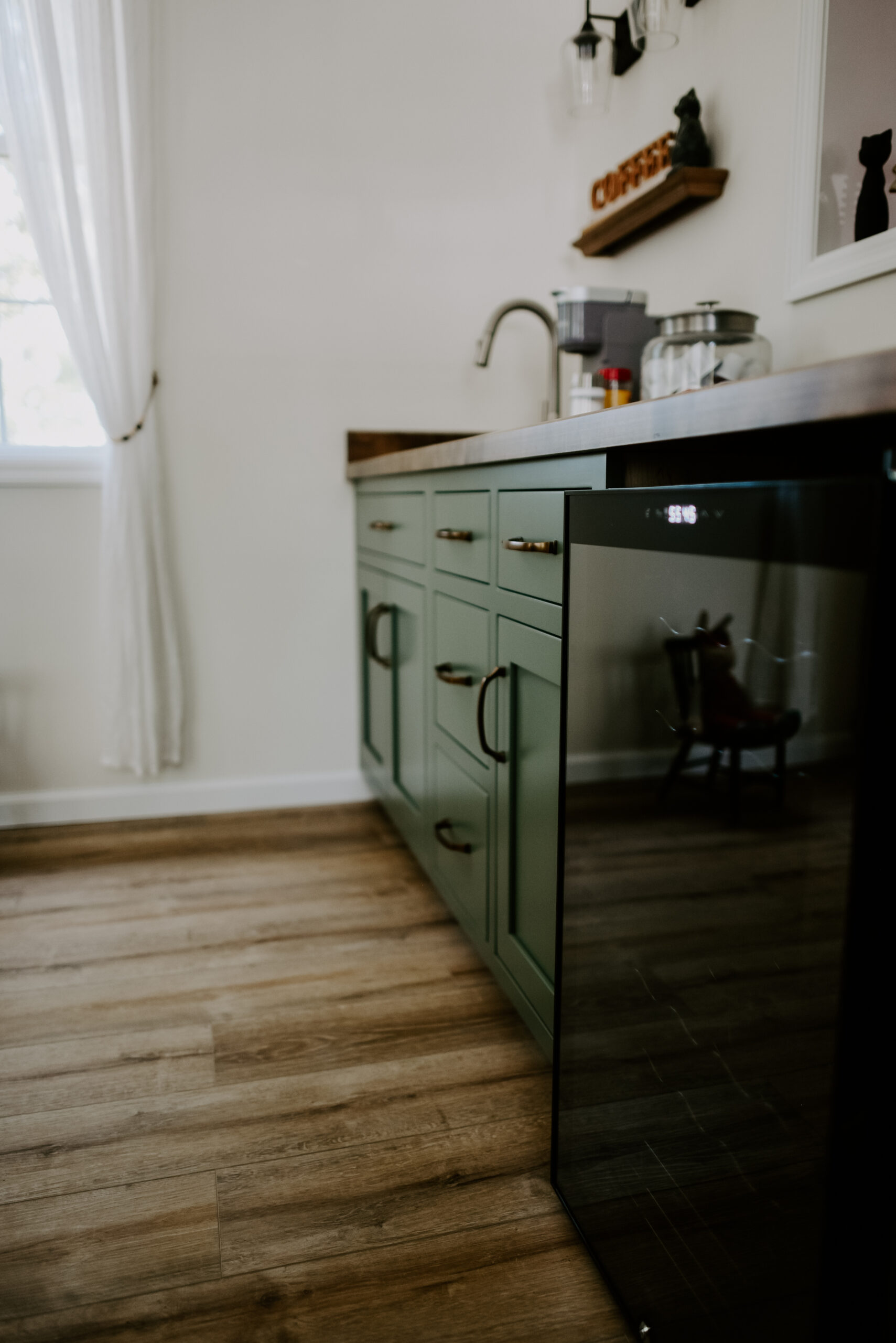 Cozy cottage addition for this homeowner with a custom kitchenette, featuring wine storage and coffee bar and custom cabinets with wood countertops and LVP flooring. Window opening from the kitchen and doorway into the dining room tie both spaces beautifully together with this new addition. Shiplap accent wall behind a wood-burning stove, wooden mantle and wood beam carries the cozy cottage design throughout this space.