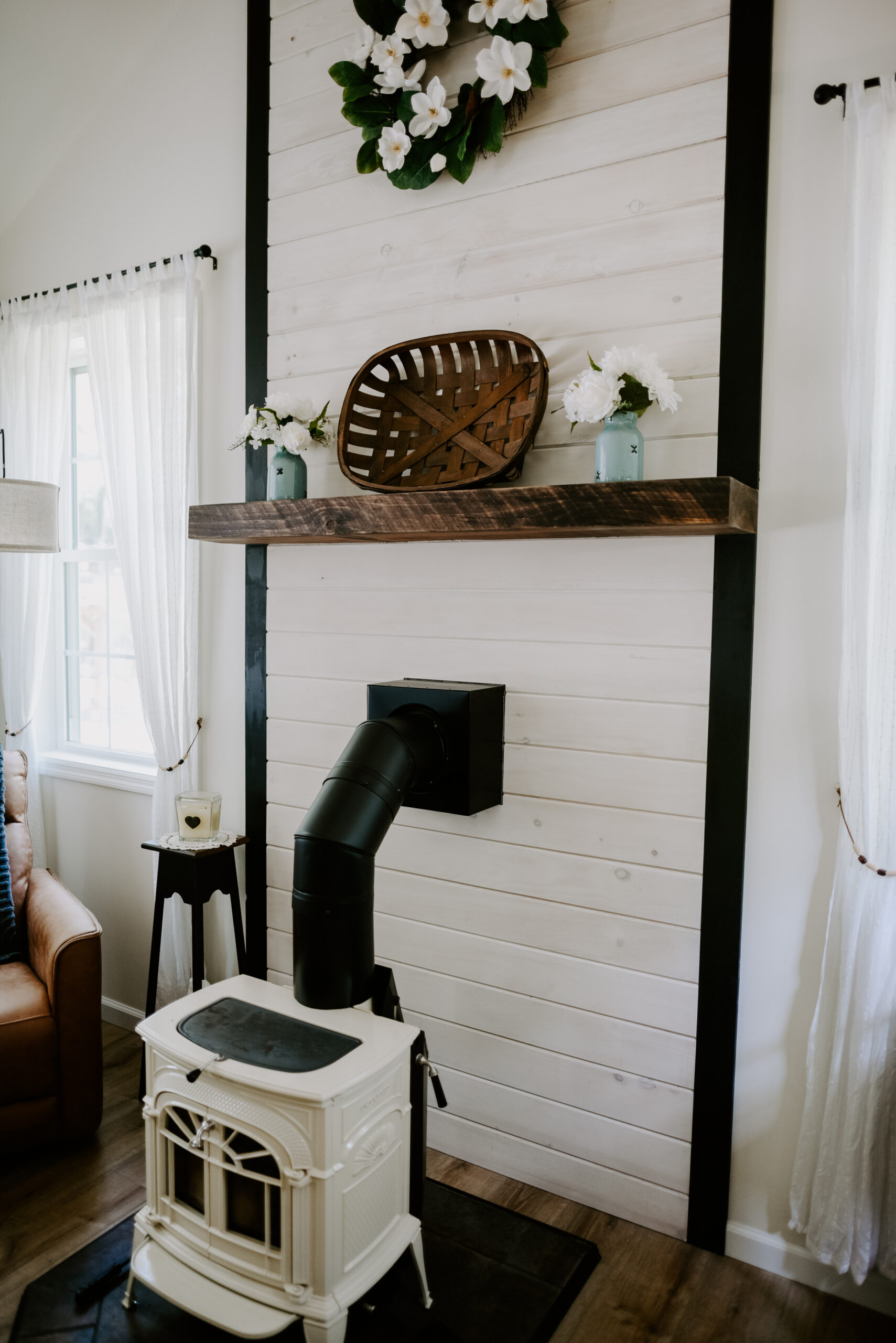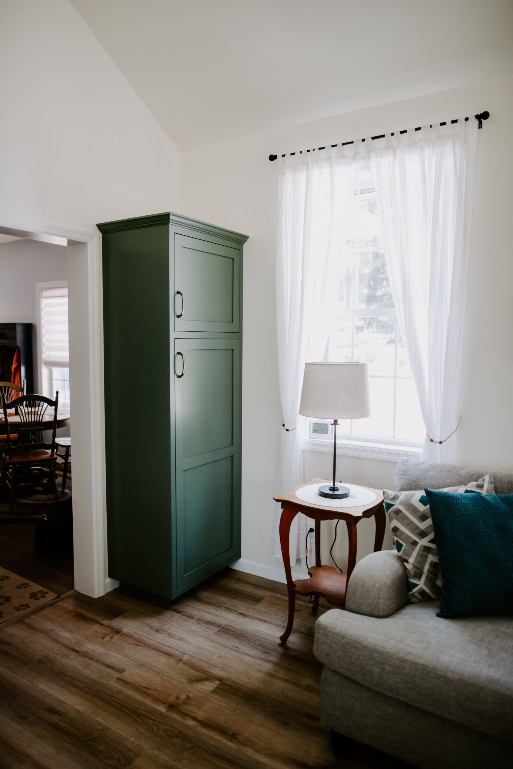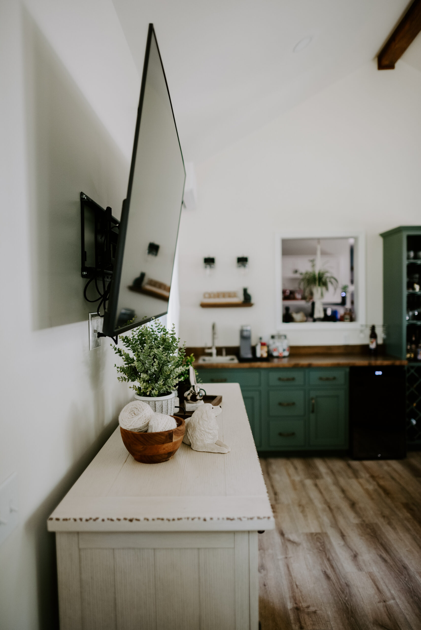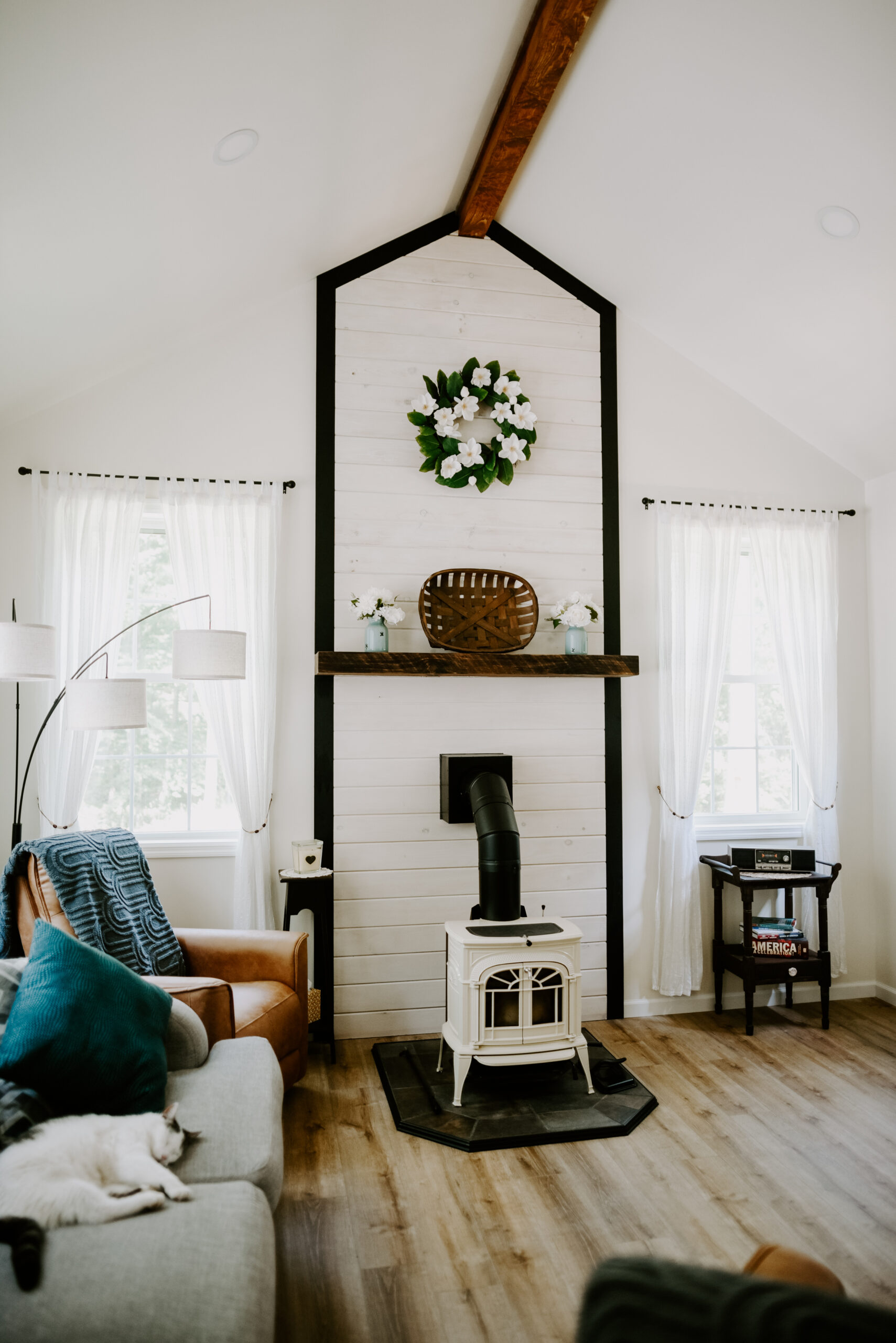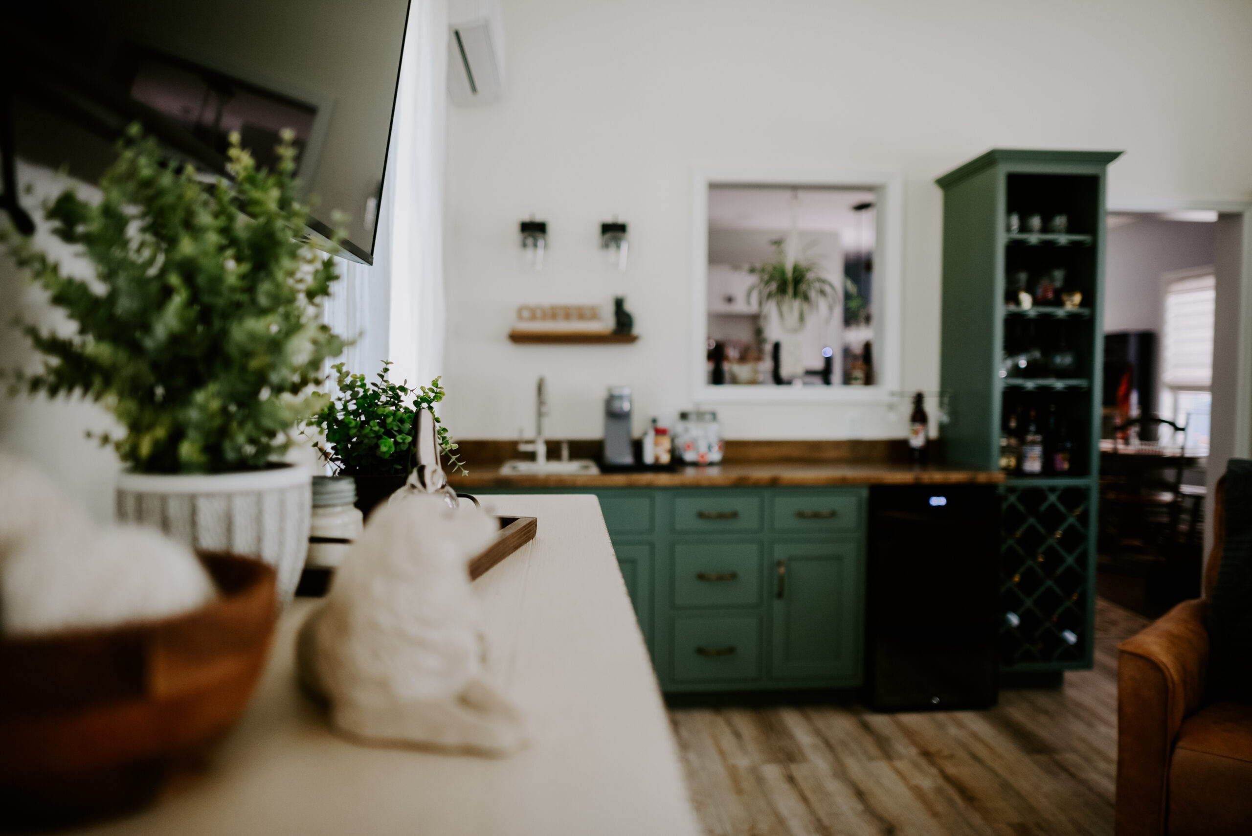 Cozy cottage addition for this homeowner with a custom kitchenette, featuring wine storage and coffee bar and custom cabinets with wood countertops and LVP flooring. Window opening from the kitchen and doorway into the dining room tie both spaces beautifully together with this new addition. Shiplap accent wall behind a wood-burning stove, wooden mantle and wood beam carries the cozy cottage design throughout this space.