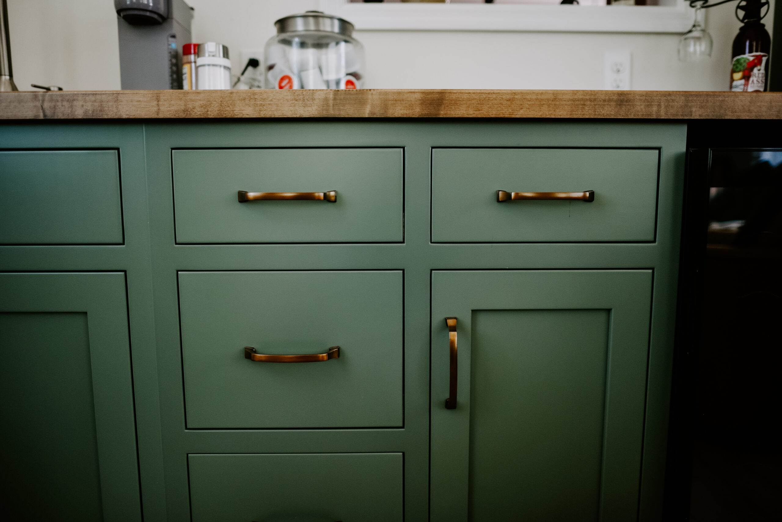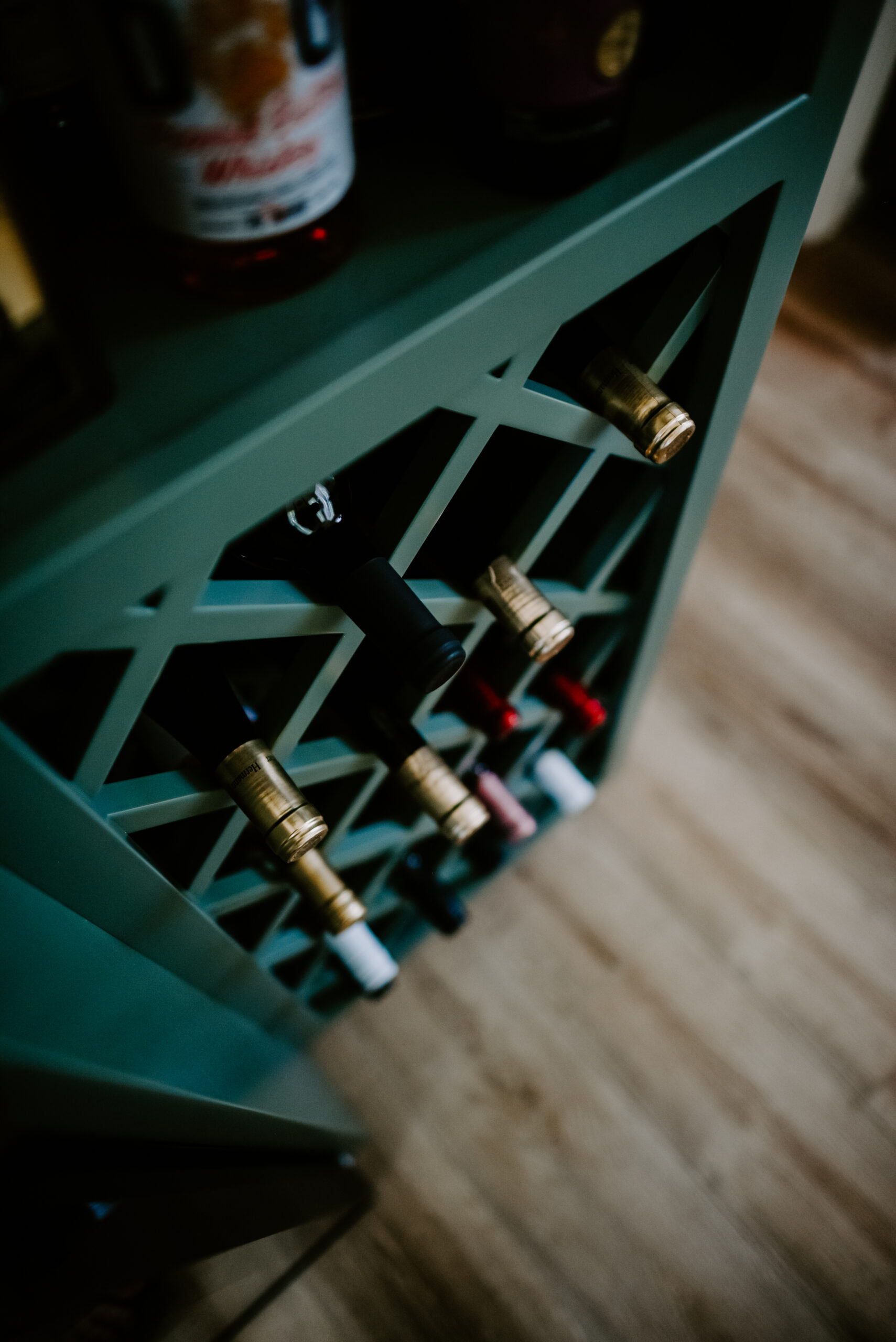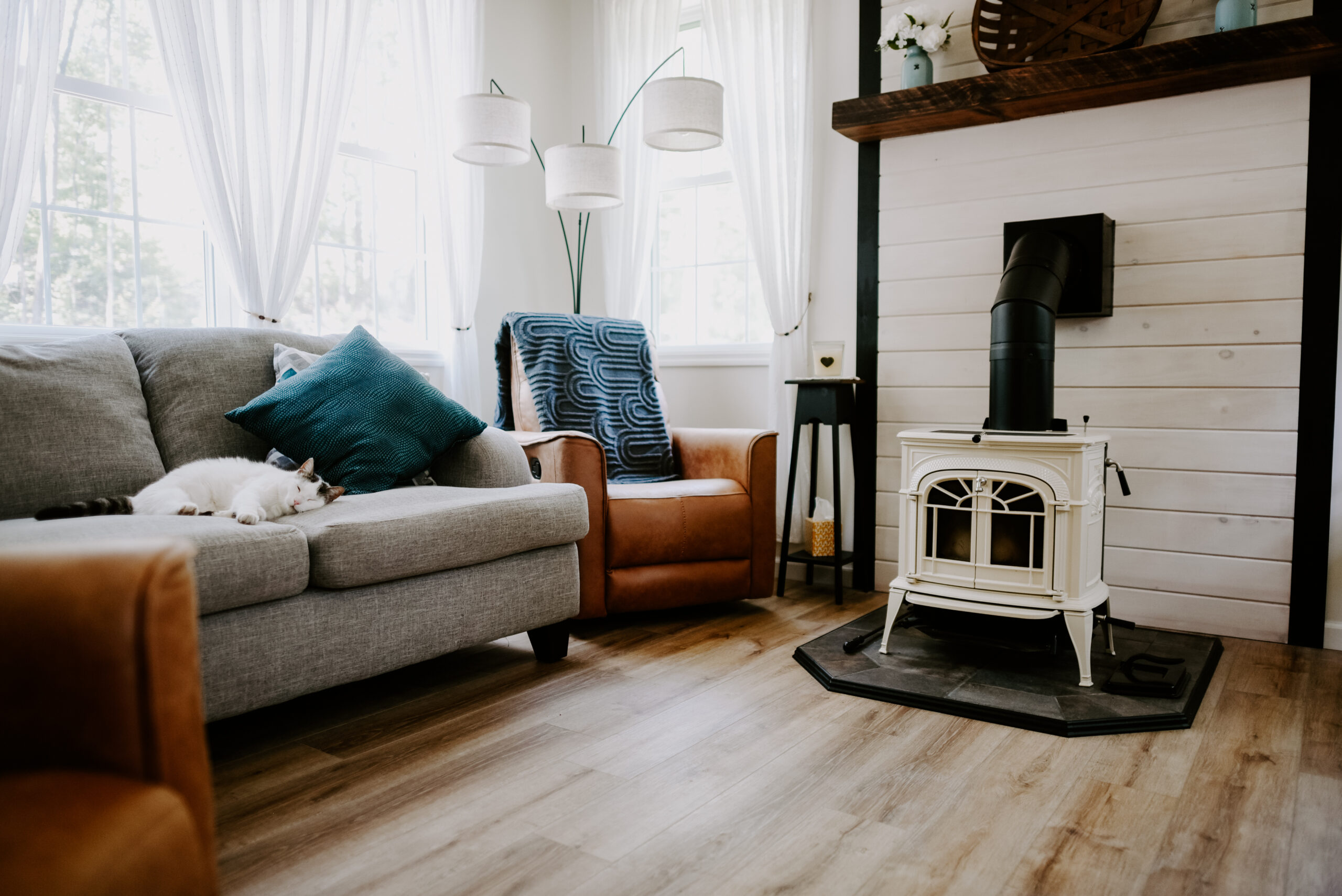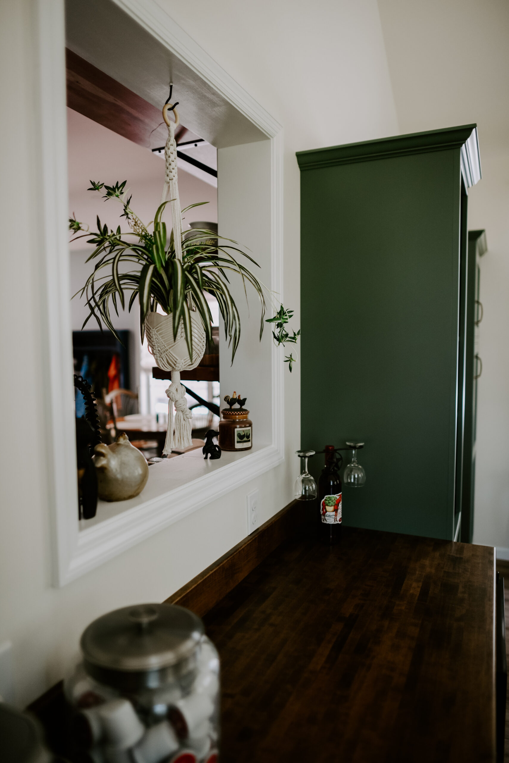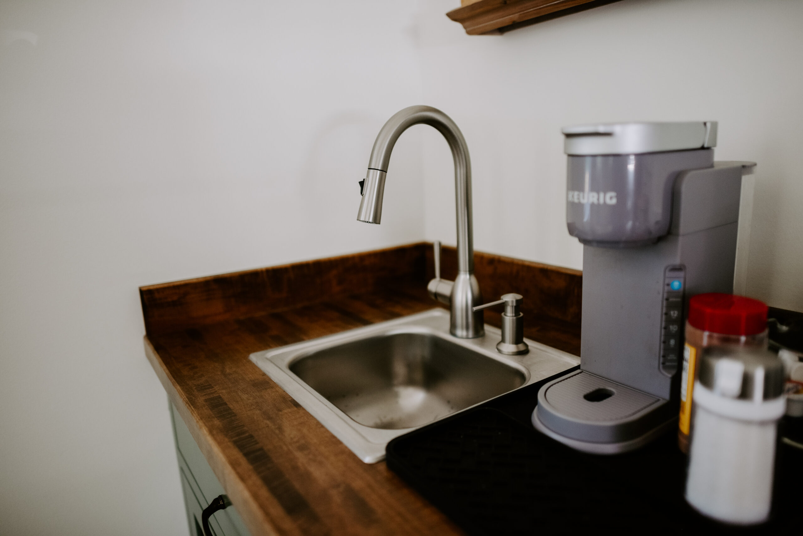 Cozy cottage addition for this homeowner with a custom kitchenette, featuring wine storage and coffee bar and custom cabinets with wood countertops and LVP flooring. Window opening from the kitchen and doorway into the dining room tie both spaces beautifully together with this new addition. Shiplap accent wall behind a wood-burning stove, wooden mantle and wood beam carries the cozy cottage design throughout this space.