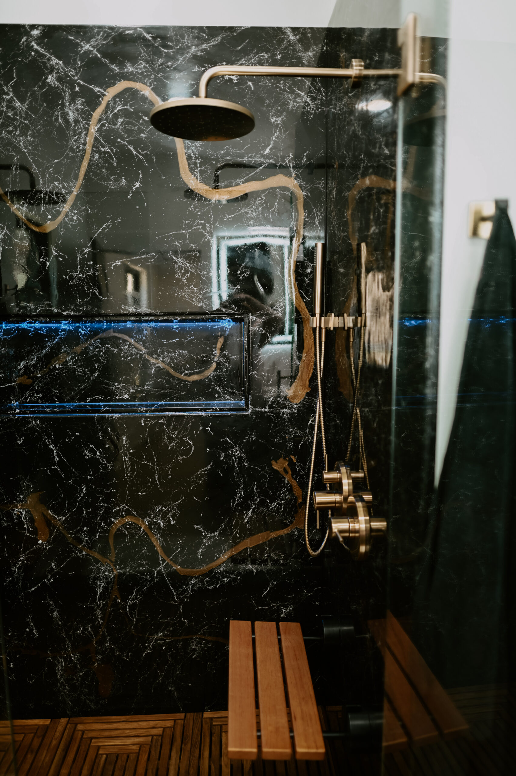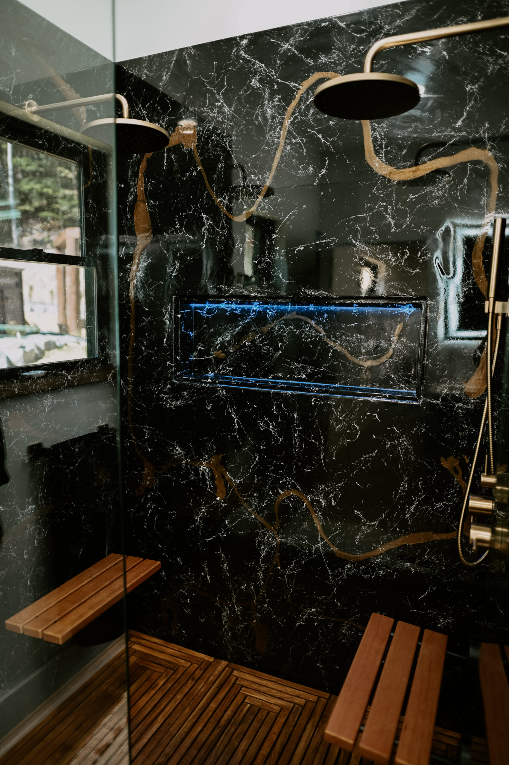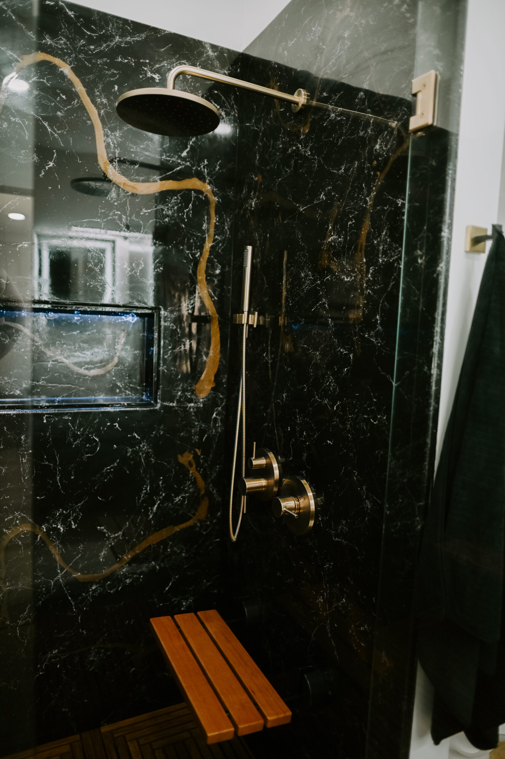 • Master bath features custom epoxy walls, teak floors and built-in benches